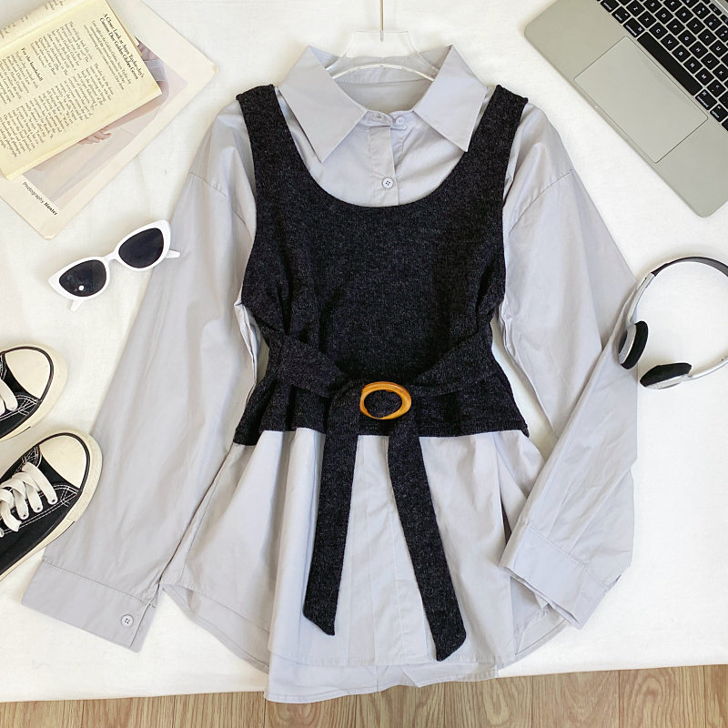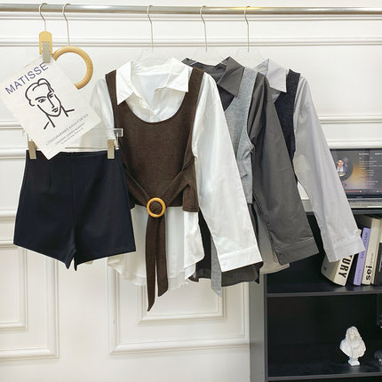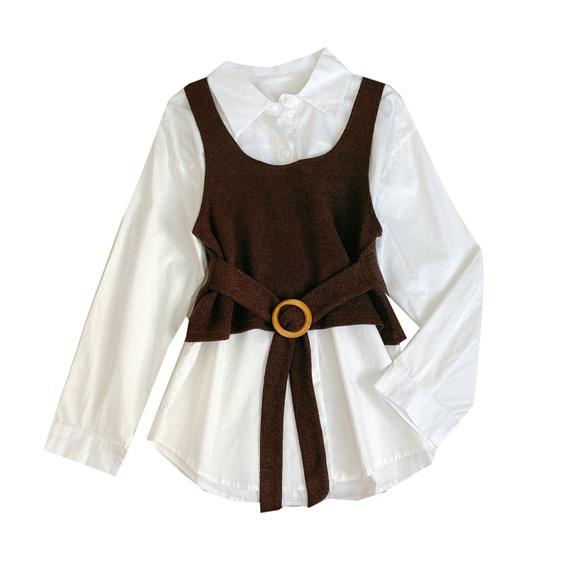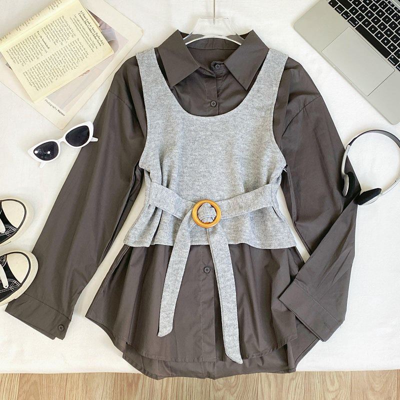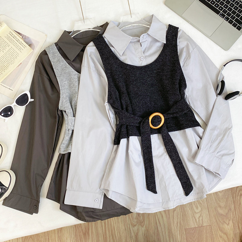 时尚百搭单排扣翻领长袖宽松衬衫上衣+绑带叠穿马甲背心两件套装