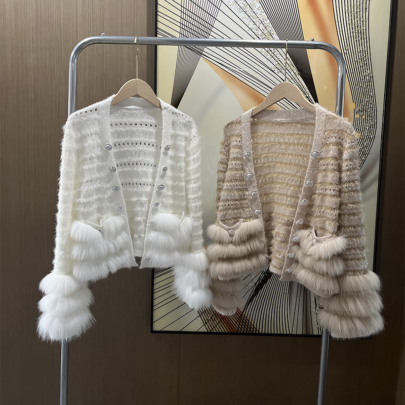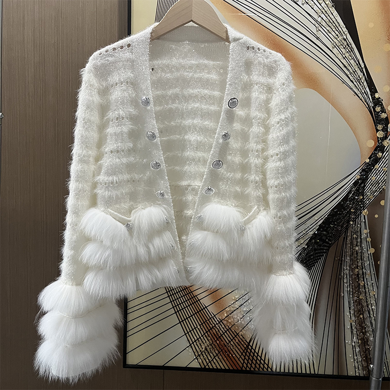 V领狐狸毛年轻款亮丝毛衣开衫女