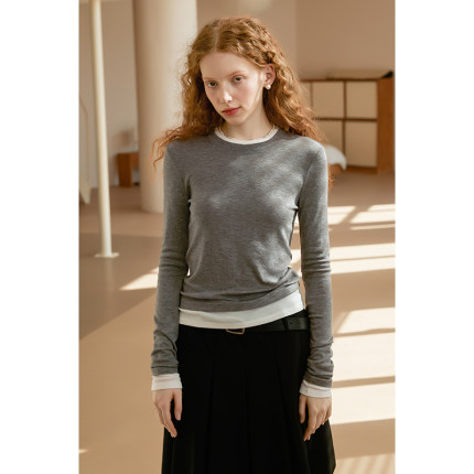 圆领天丝羊毛撞色拼接假两件打底衫长袖T恤女春新款叠穿内搭上衣
