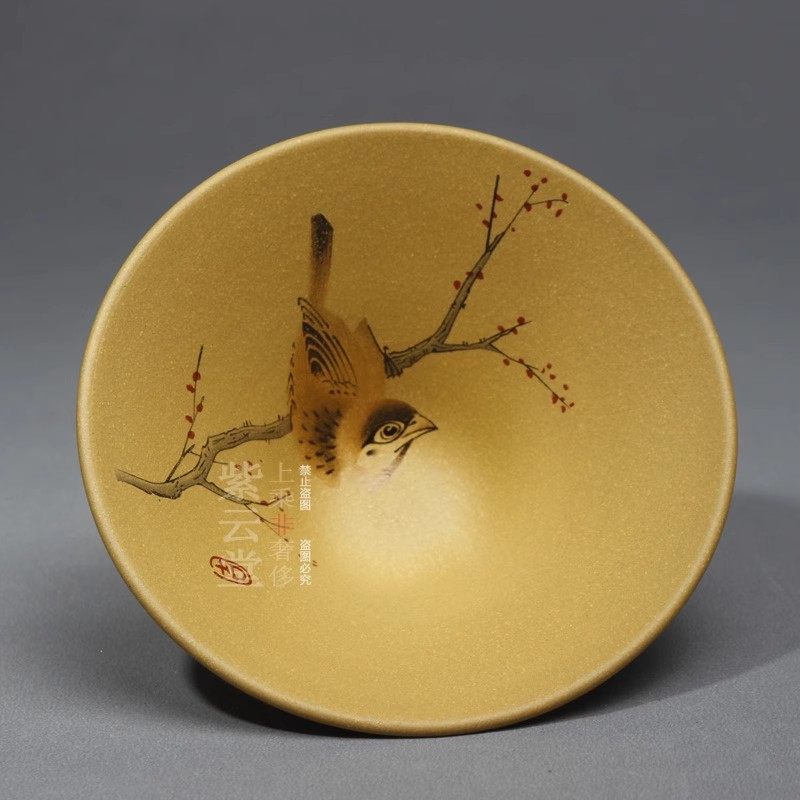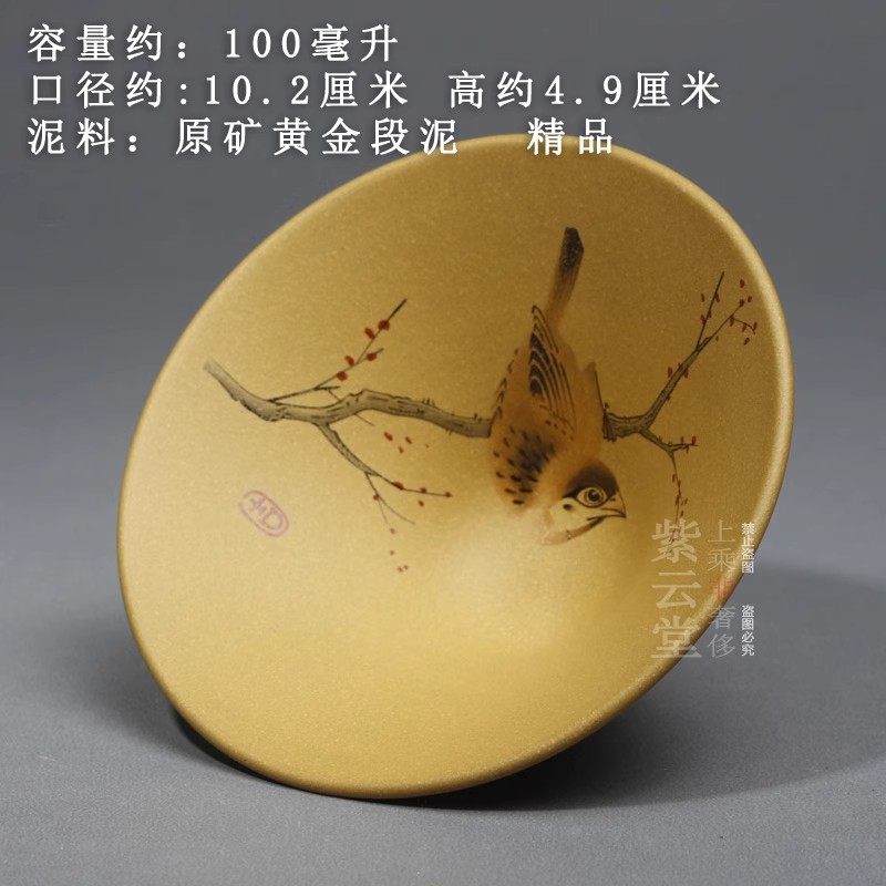 紫云堂宜兴紫砂杯手工斗笠杯主人杯原矿黄金段泥贴花鸟品茗杯单杯