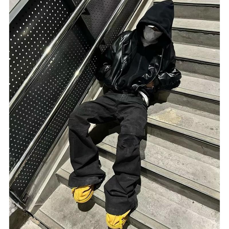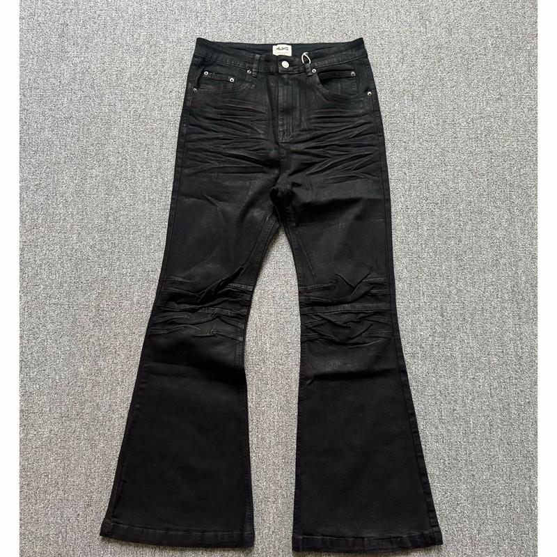 自主小众黑胶涂层堆积微喇叭直筒牛仔裤刷蜡面休闲黑色长裤潮男女