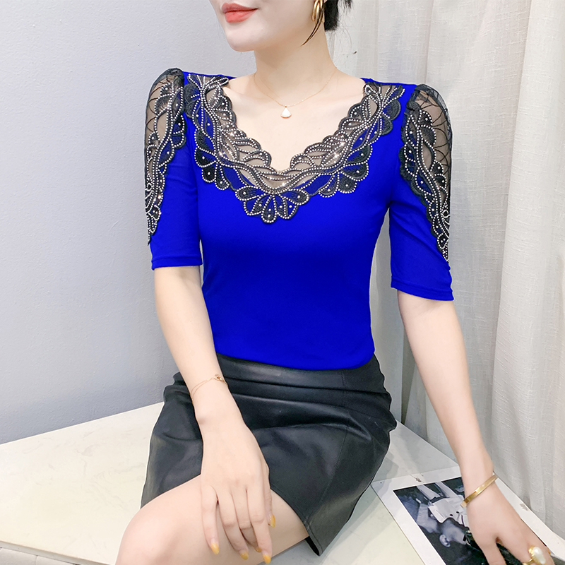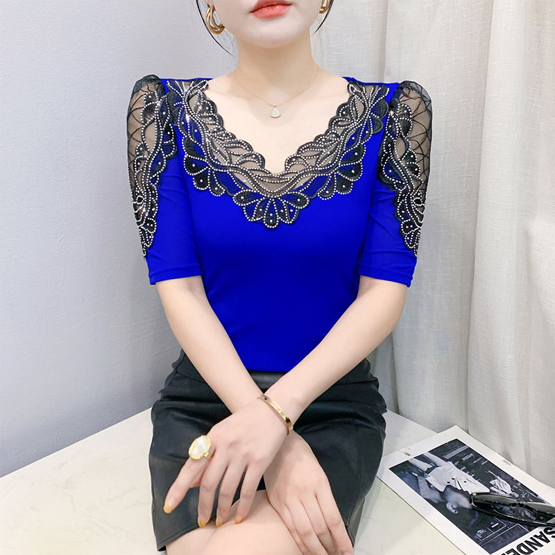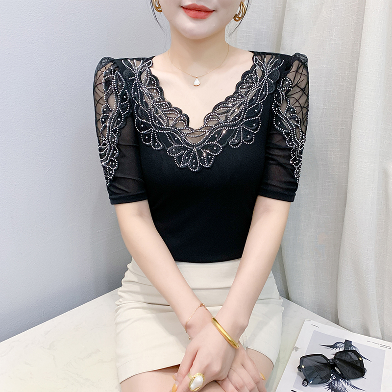 欧货小衫女夏季新款性感V领闪钻短袖T恤气质网纱花边紧身显瘦上衣