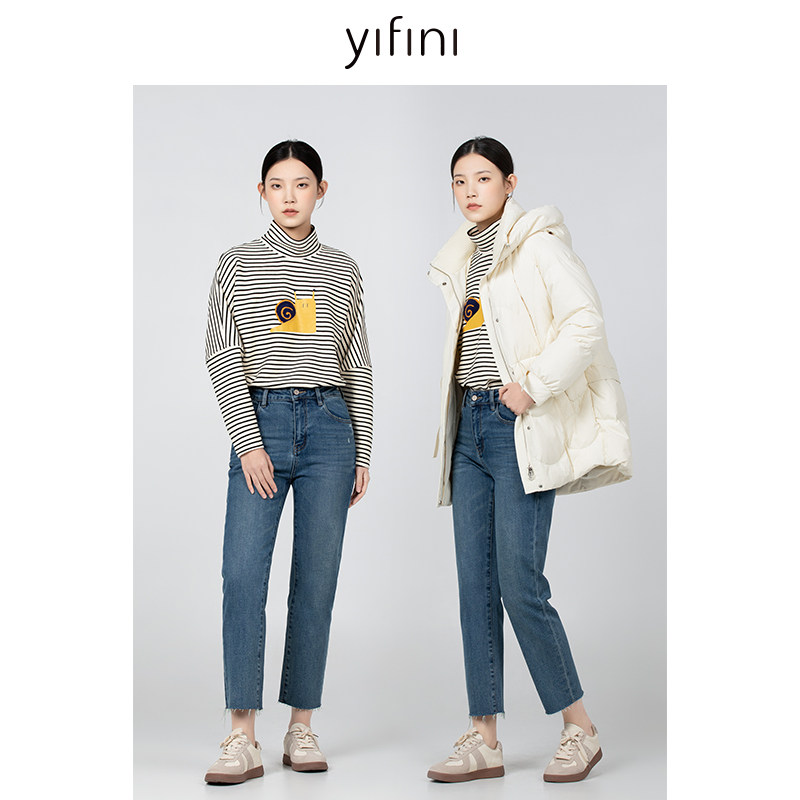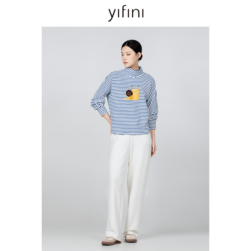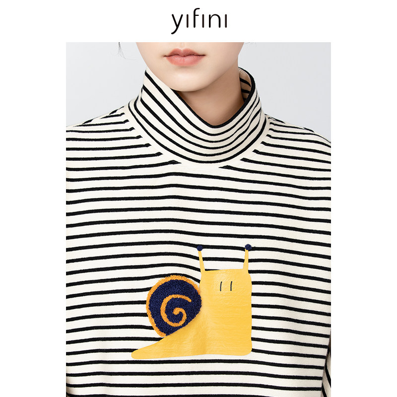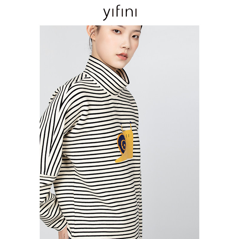 Yifini/易菲复古条纹高领宽松针织长袖T恤女秋冬新款百搭上衣