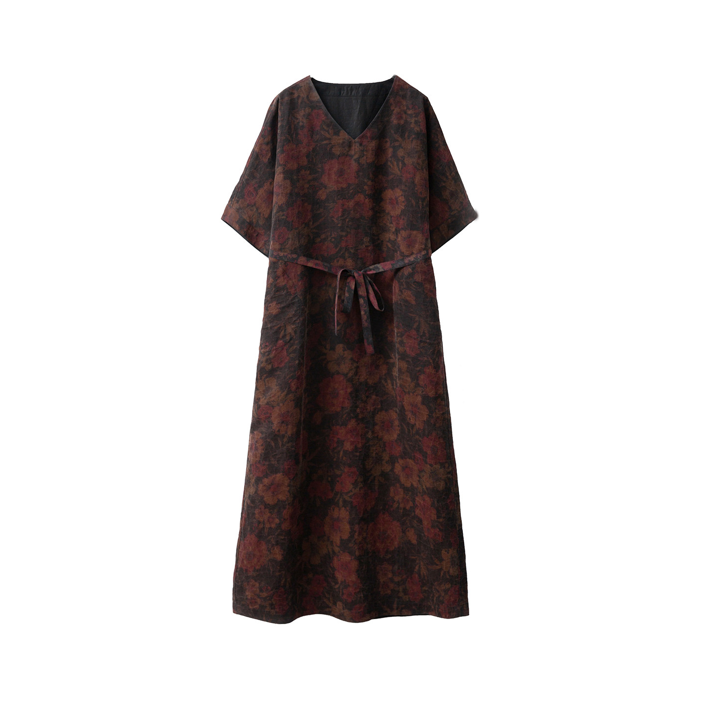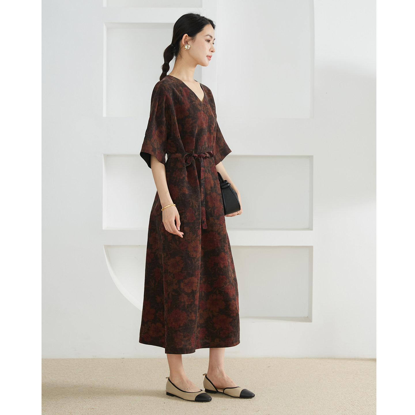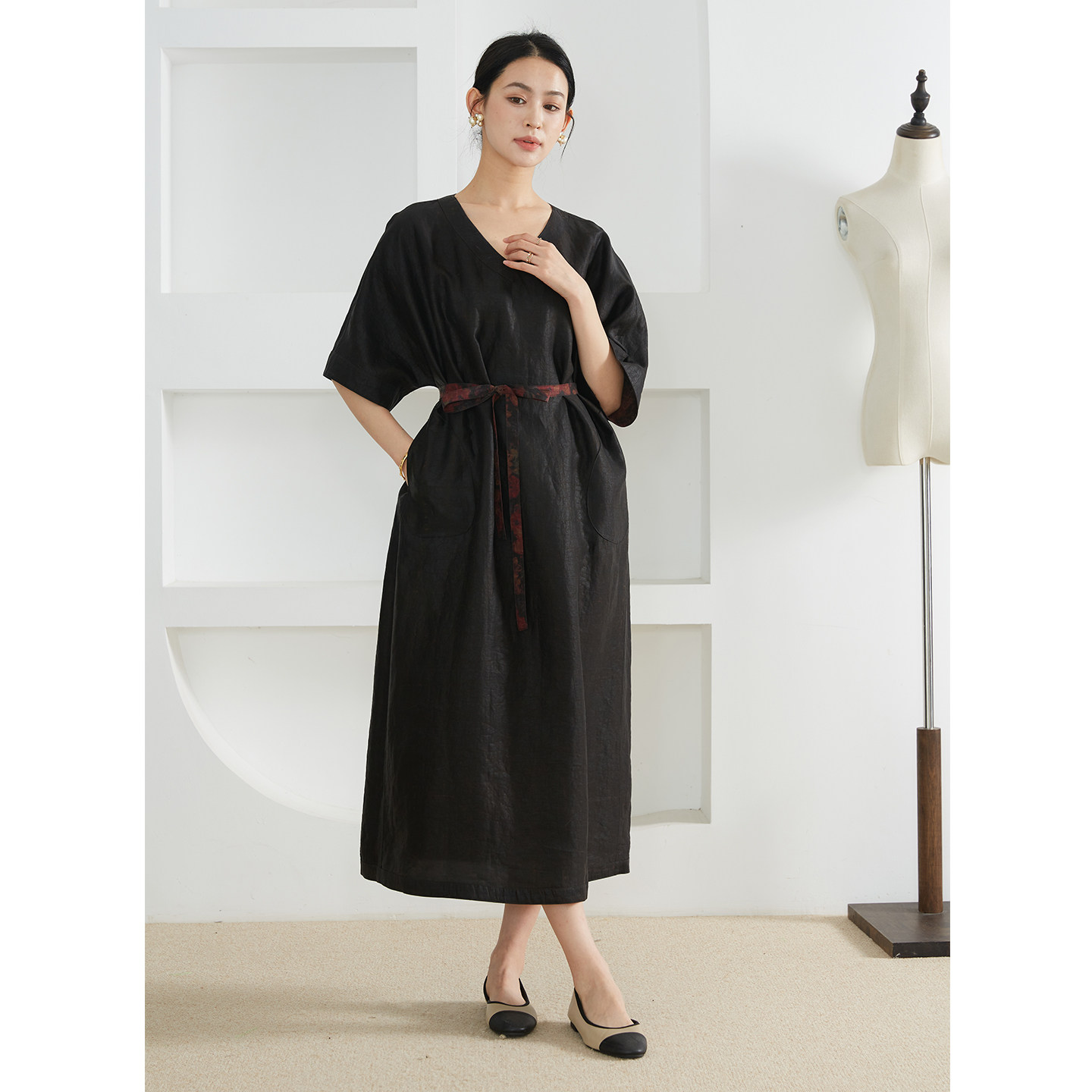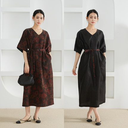 一丝牵 100%桑蚕丝真丝香云纱连衣裙慵懒极简大版袍子长裙有腰带