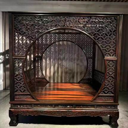 老挝大红酸枝架子床双人床交趾黄檀双月洞式红木床拨步床别墅家具