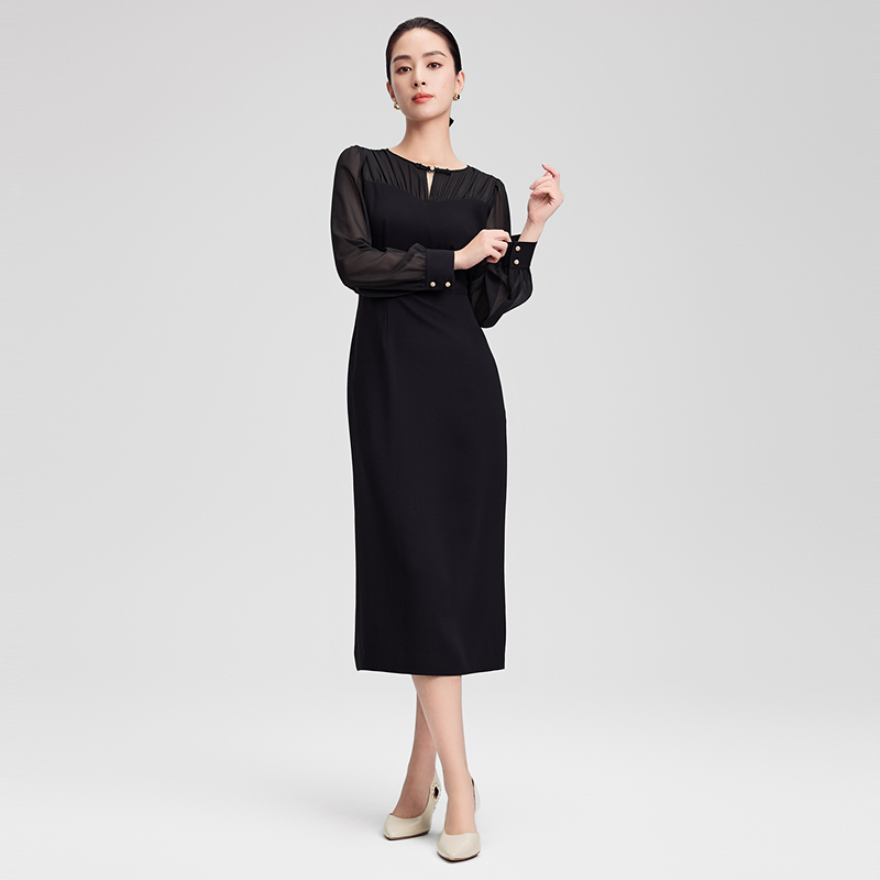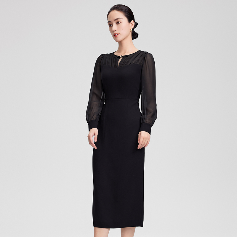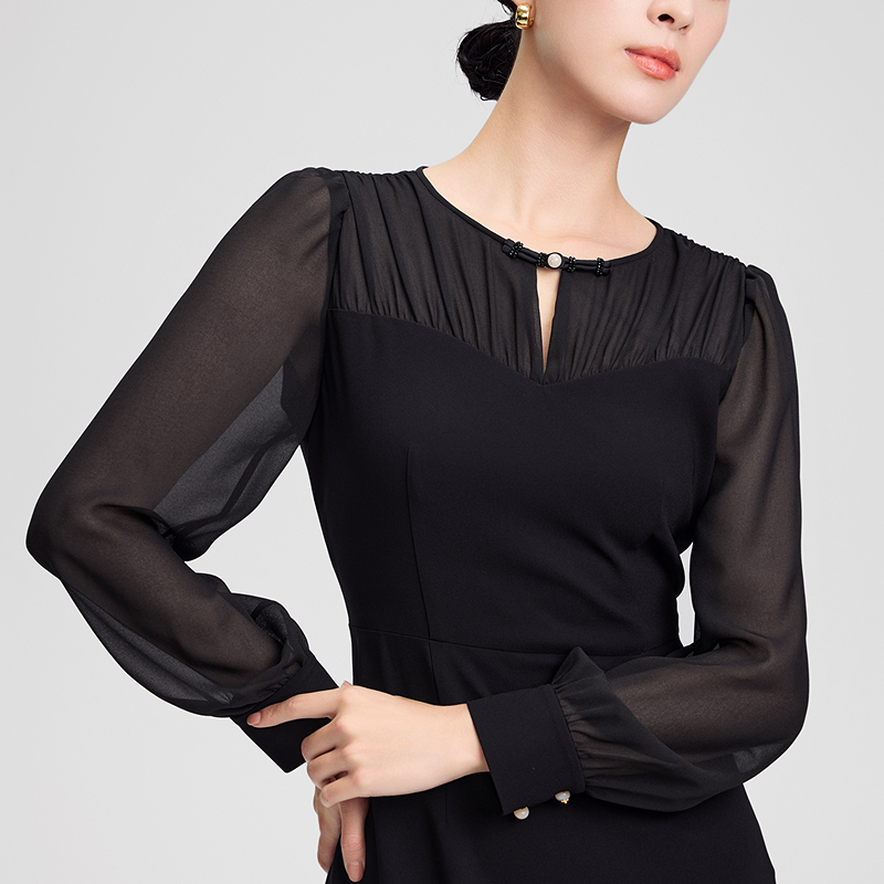 赢智尚三醋酸连衣裙秋新款拼接雪纺长袖优雅气质新中式修身小黑裙