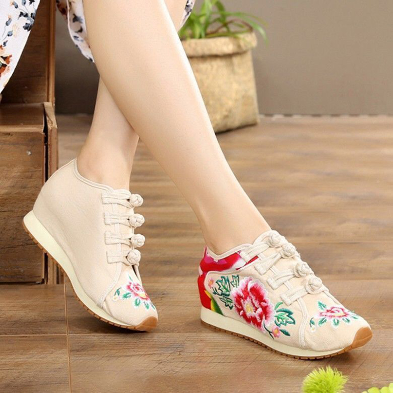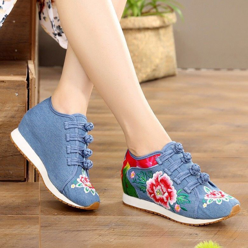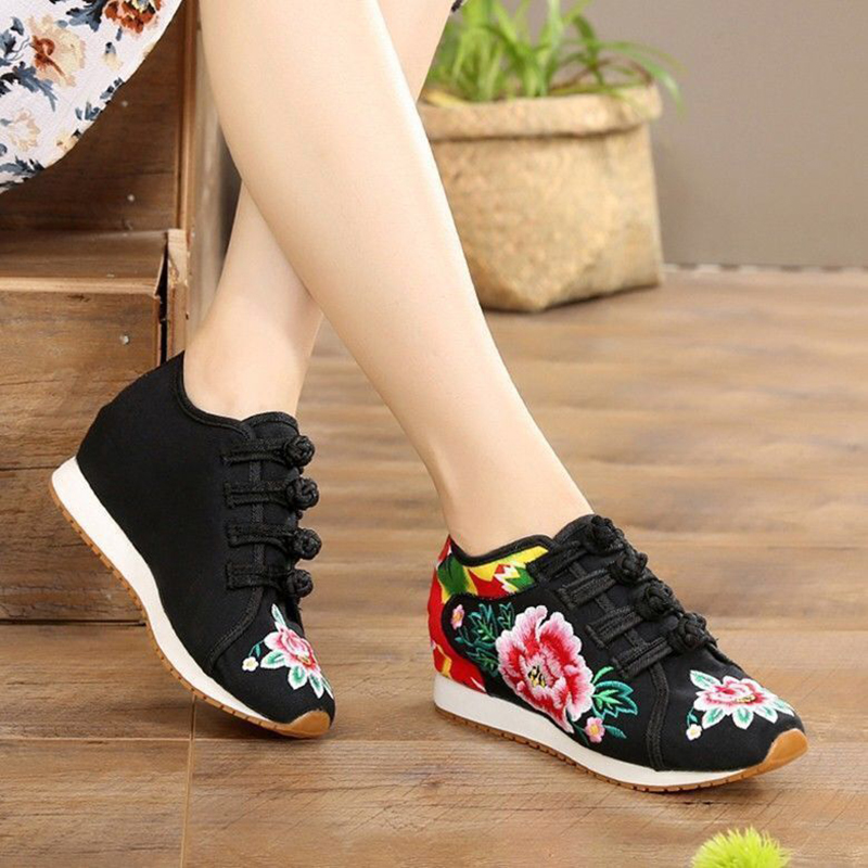 老北京布鞋坡跟内增高绣花鞋牛筋底民族风女运动鞋加绒广场舞蹈鞋