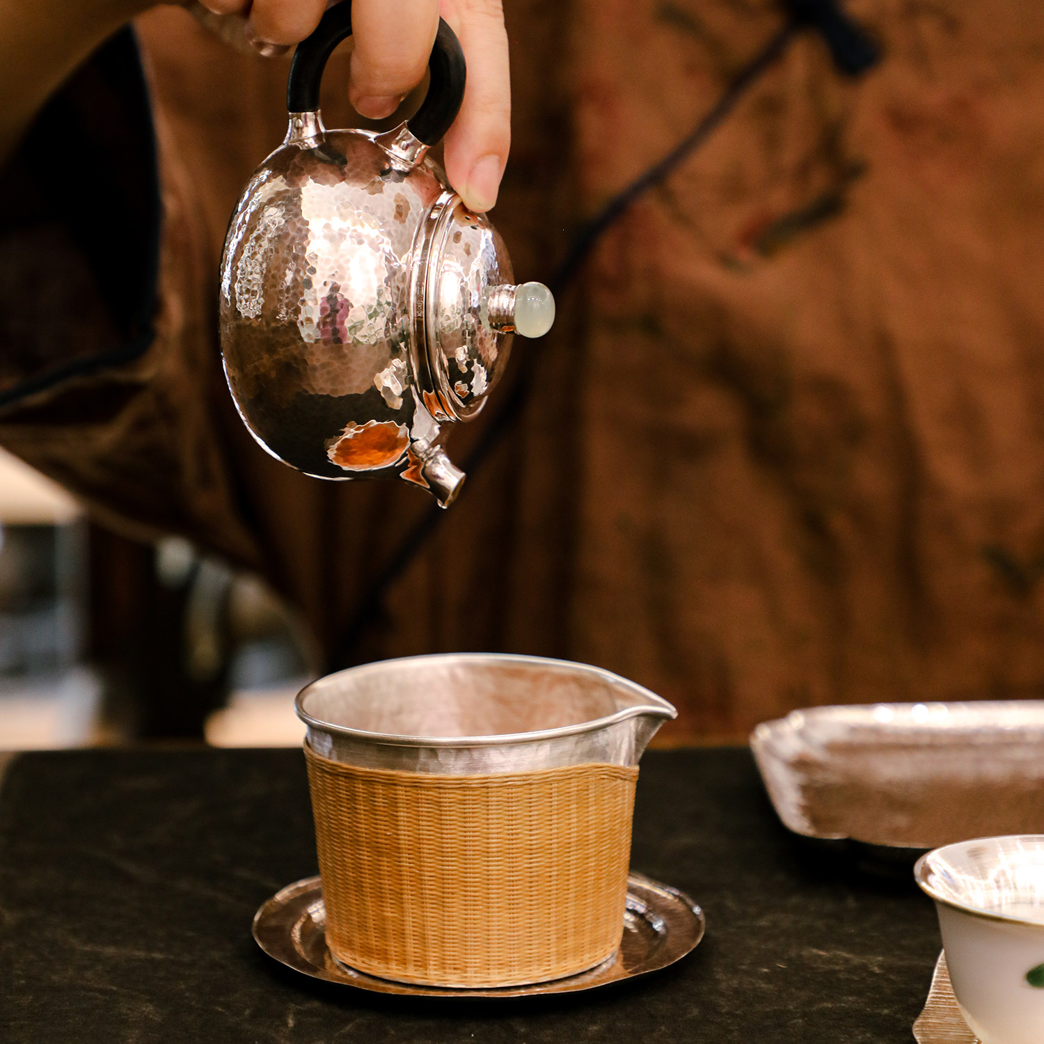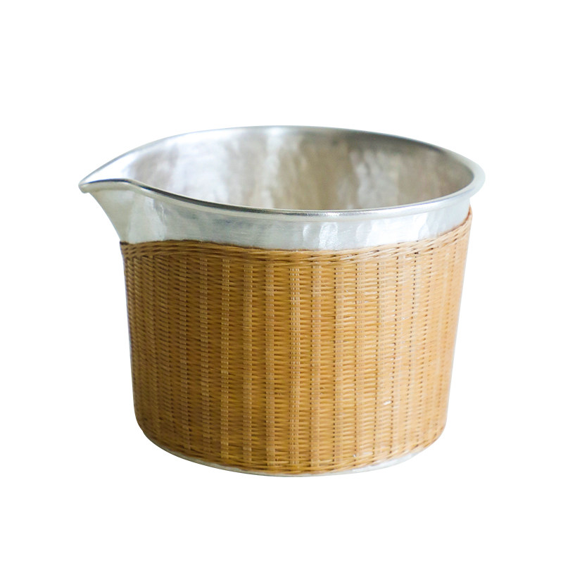 纯银时代 圆形竹编公道杯足银999纯手工一张打匀杯分茶器230ml
