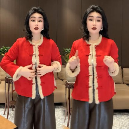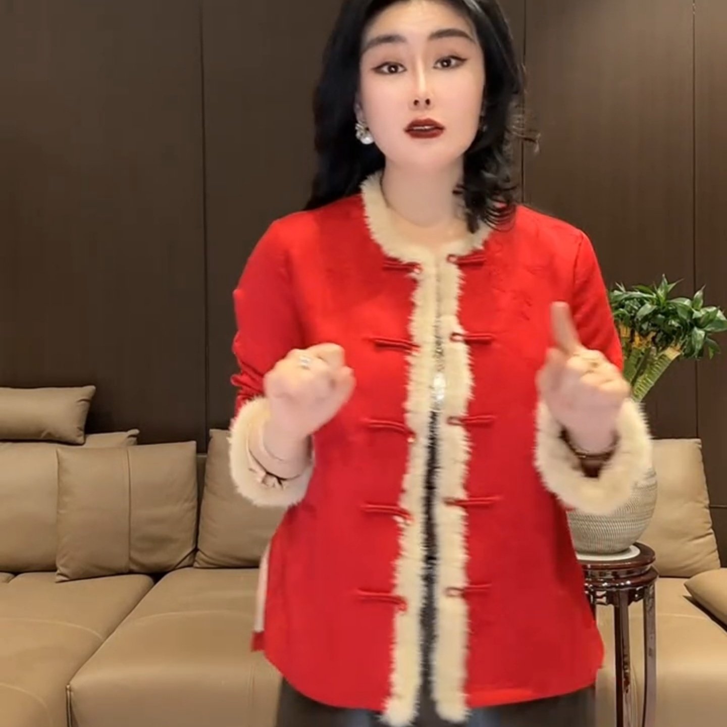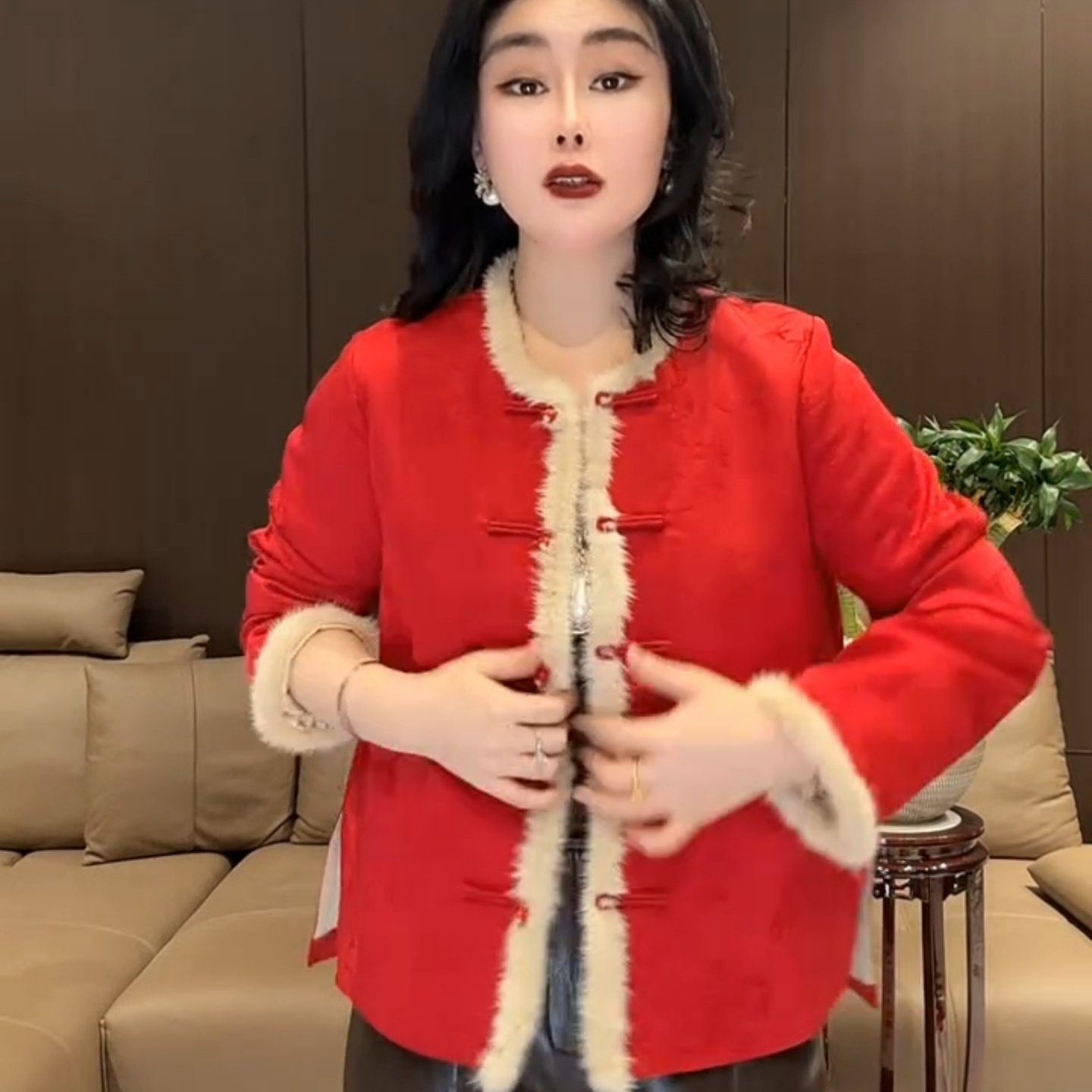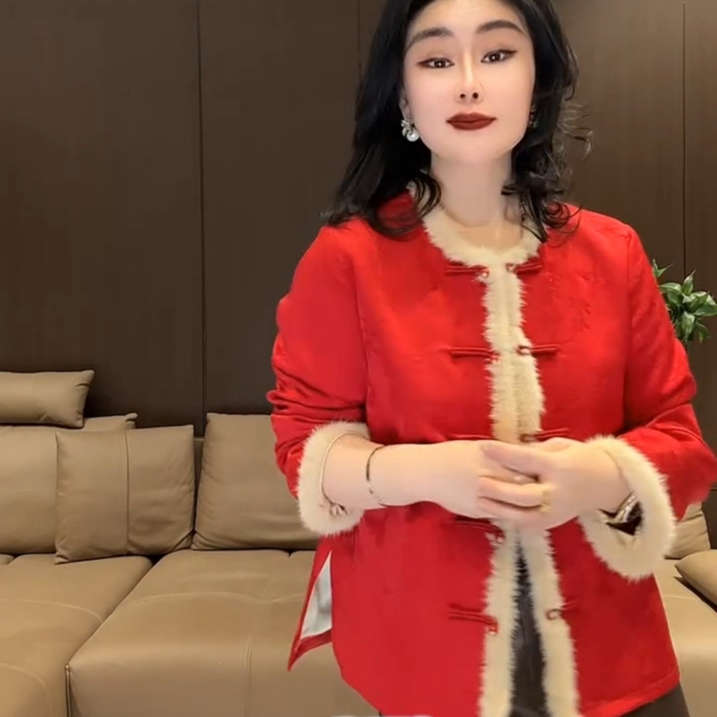 2025秋冬季时尚新中式红色喜庆拼貂毛边加棉国风外套棉服上衣女