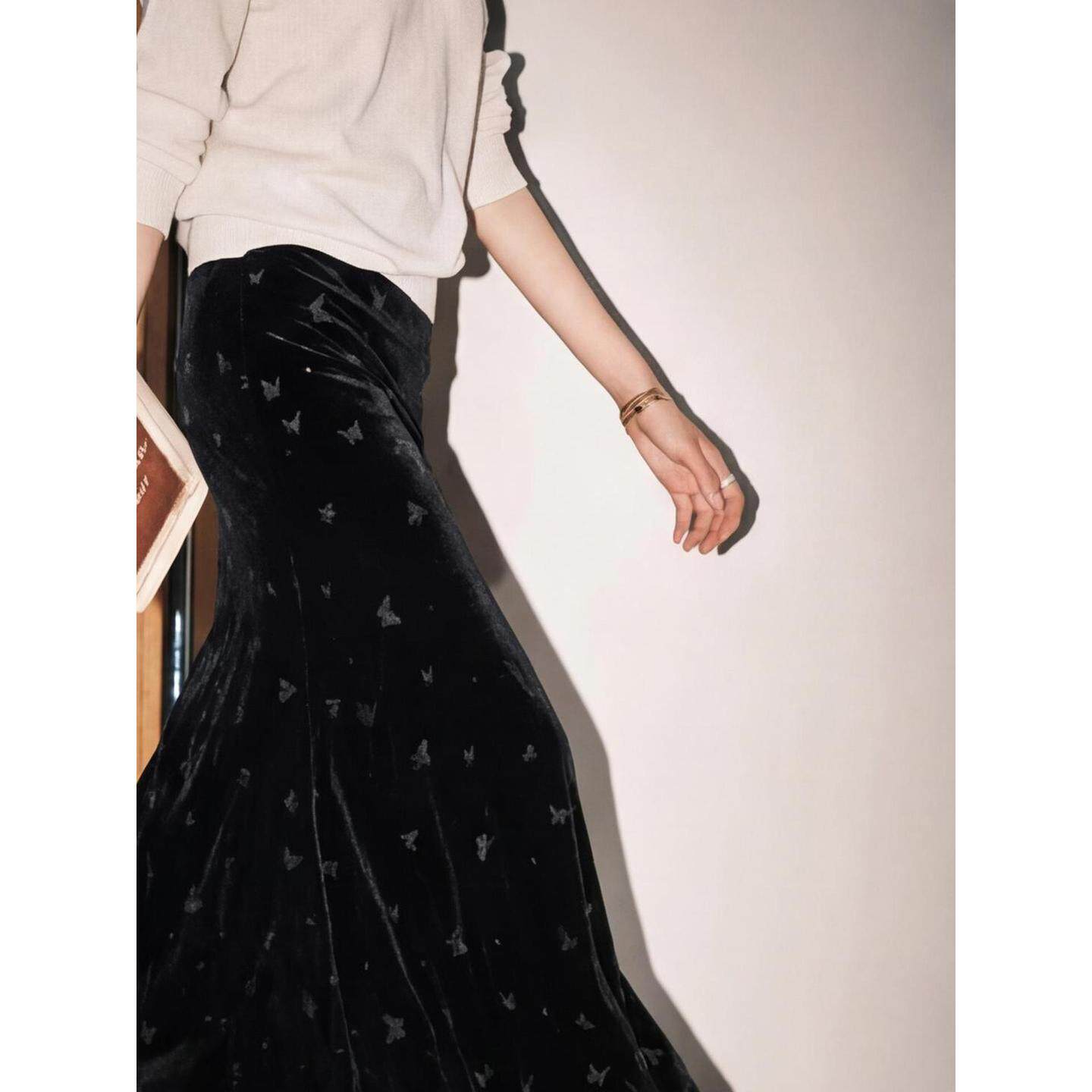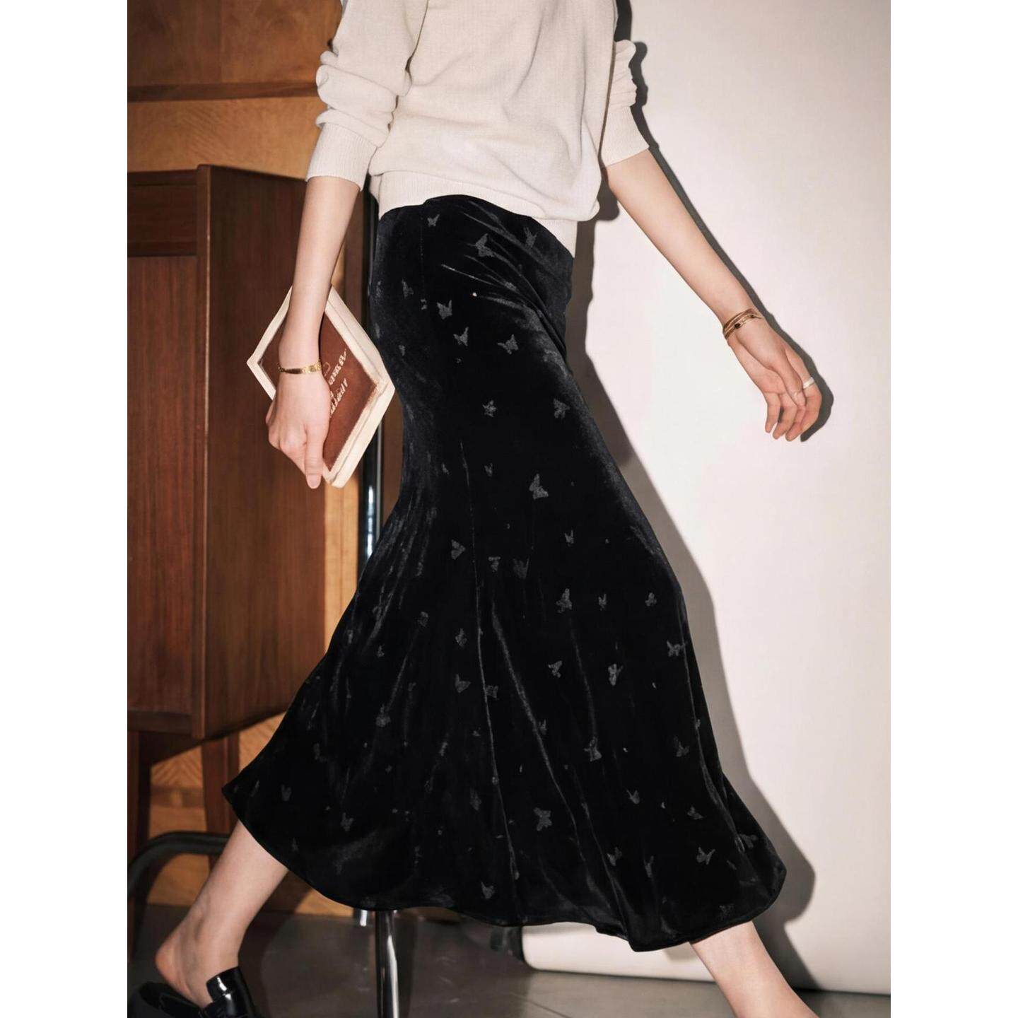 家好黑色高腰丝绒蝴蝶半身裙女