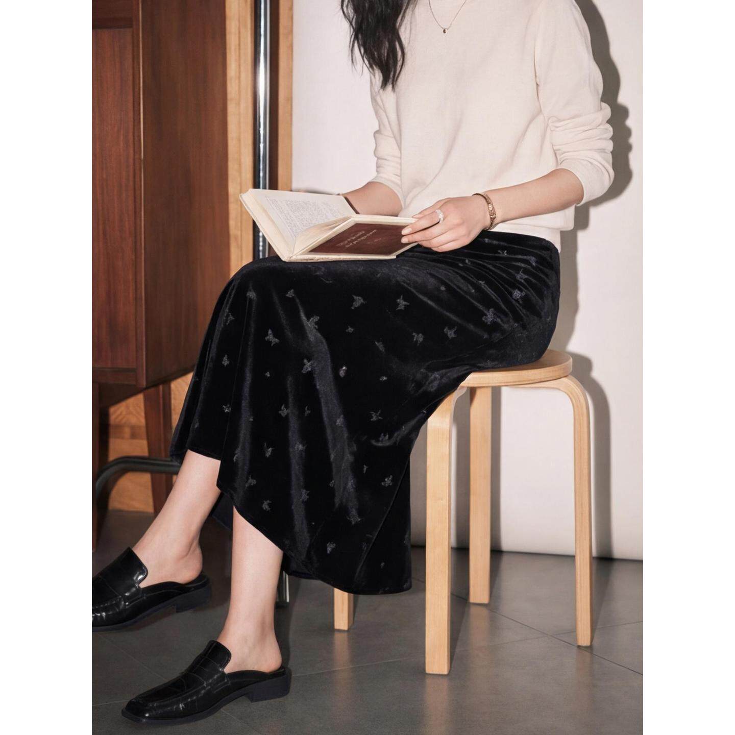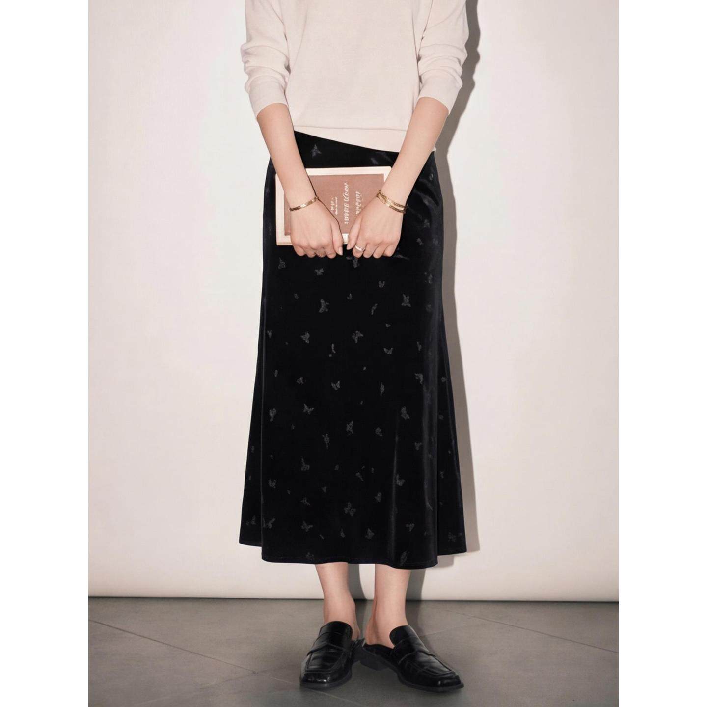 Basic House/百家好黑色丝绒蝴蝶半身裙女2026春季新款高腰A字裙