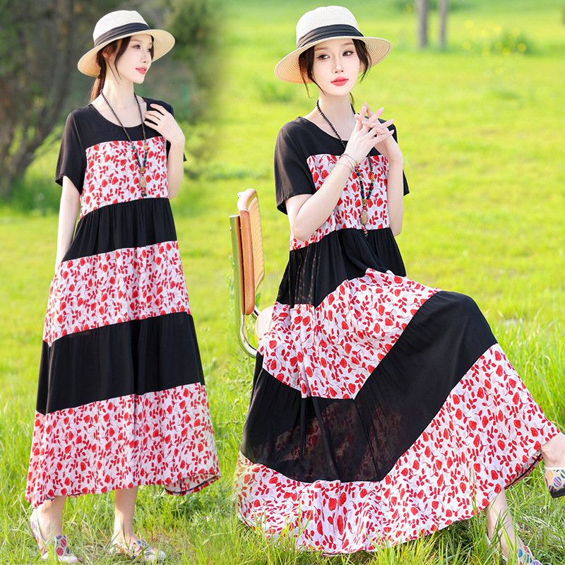 女装短袖t恤裙棉绸连衣裙子收腰遮肉遮肚子长裙大摆裙摆a字裙绵绸