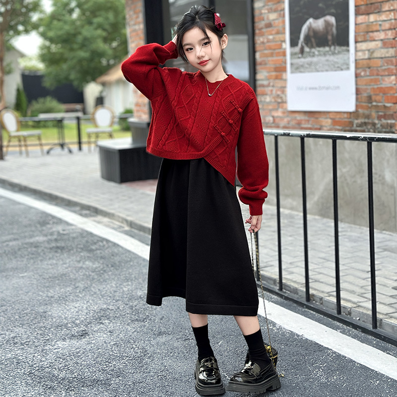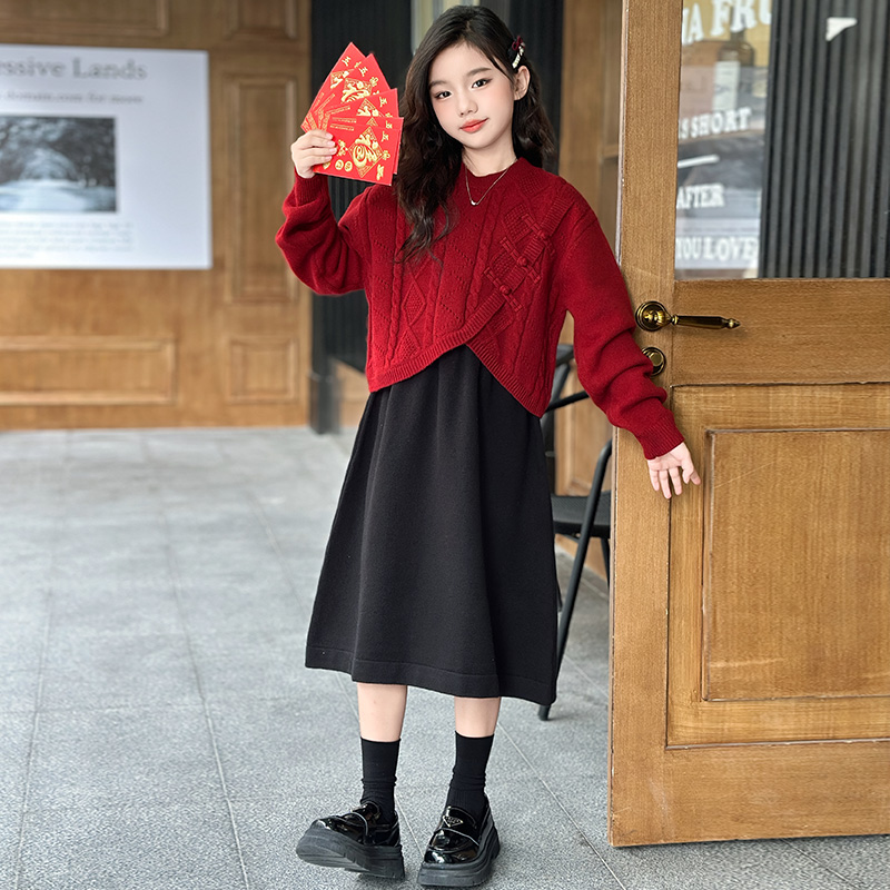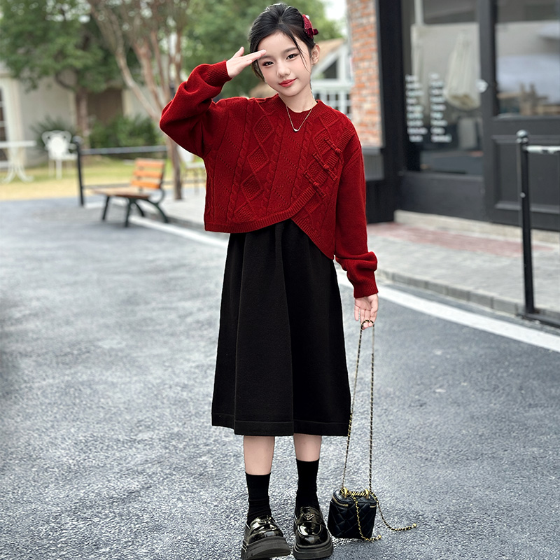 女童连衣裙秋冬款儿童裙子冬季小香风高级感大童套裙红色新年衣服