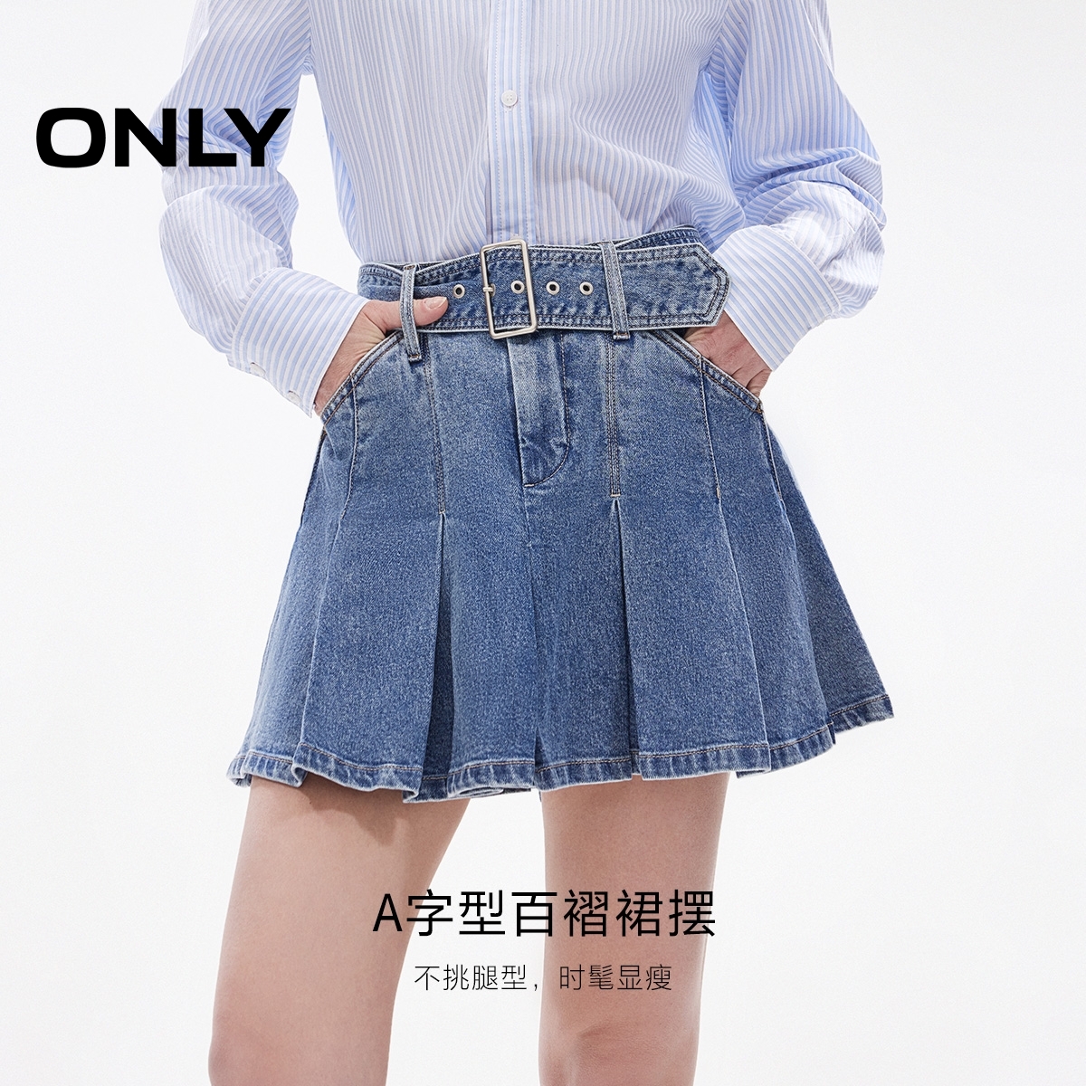 ONLY2025秋季新款甜美减龄腰带装饰A字百褶高腰短裙牛仔半身裙女