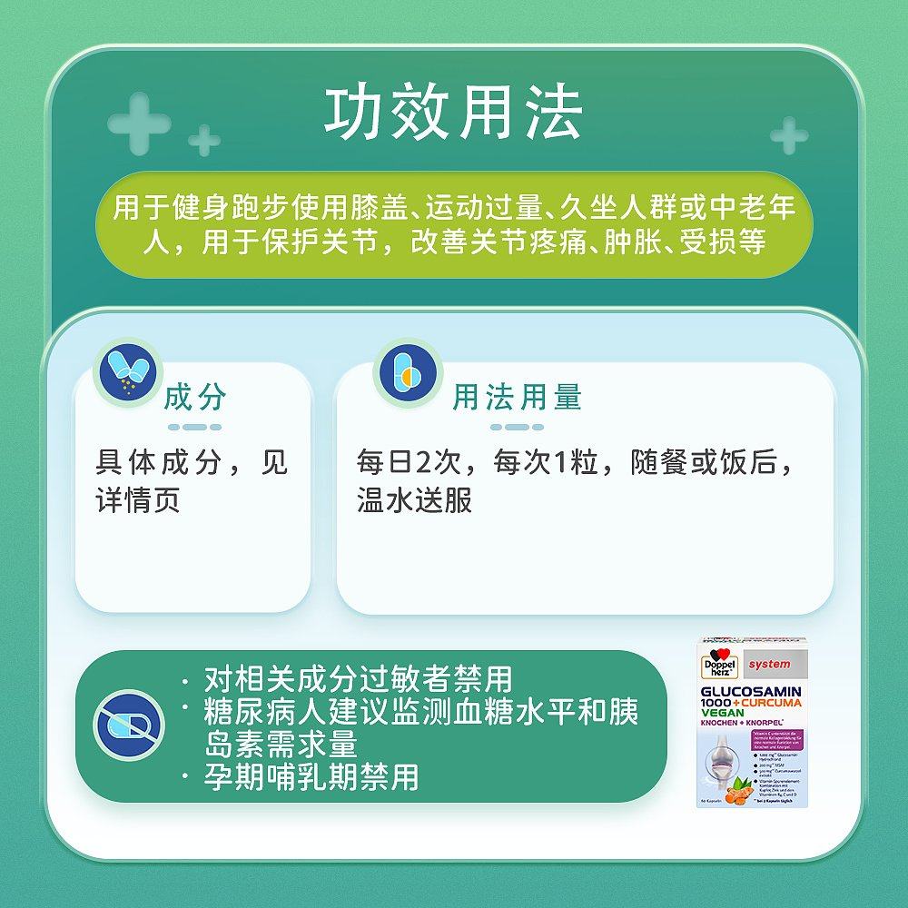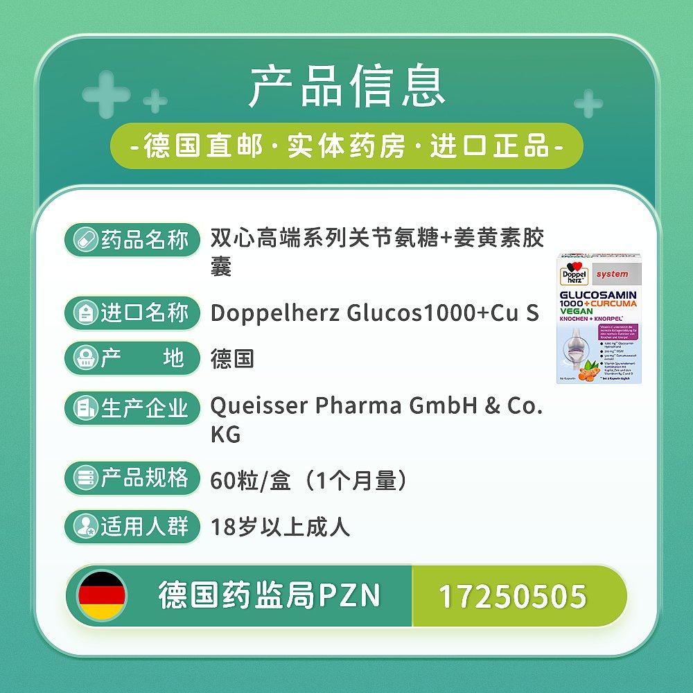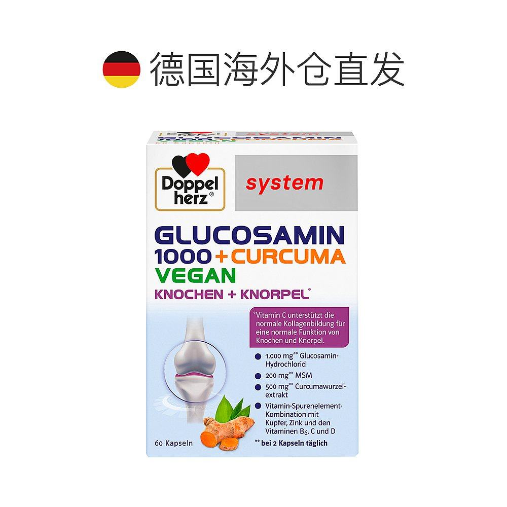 欧洲直邮德国双心Doppelherz药店版关节氨糖1000+姜黄素胶囊60粒