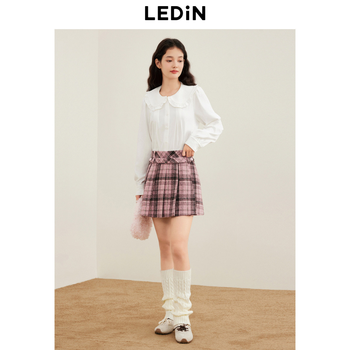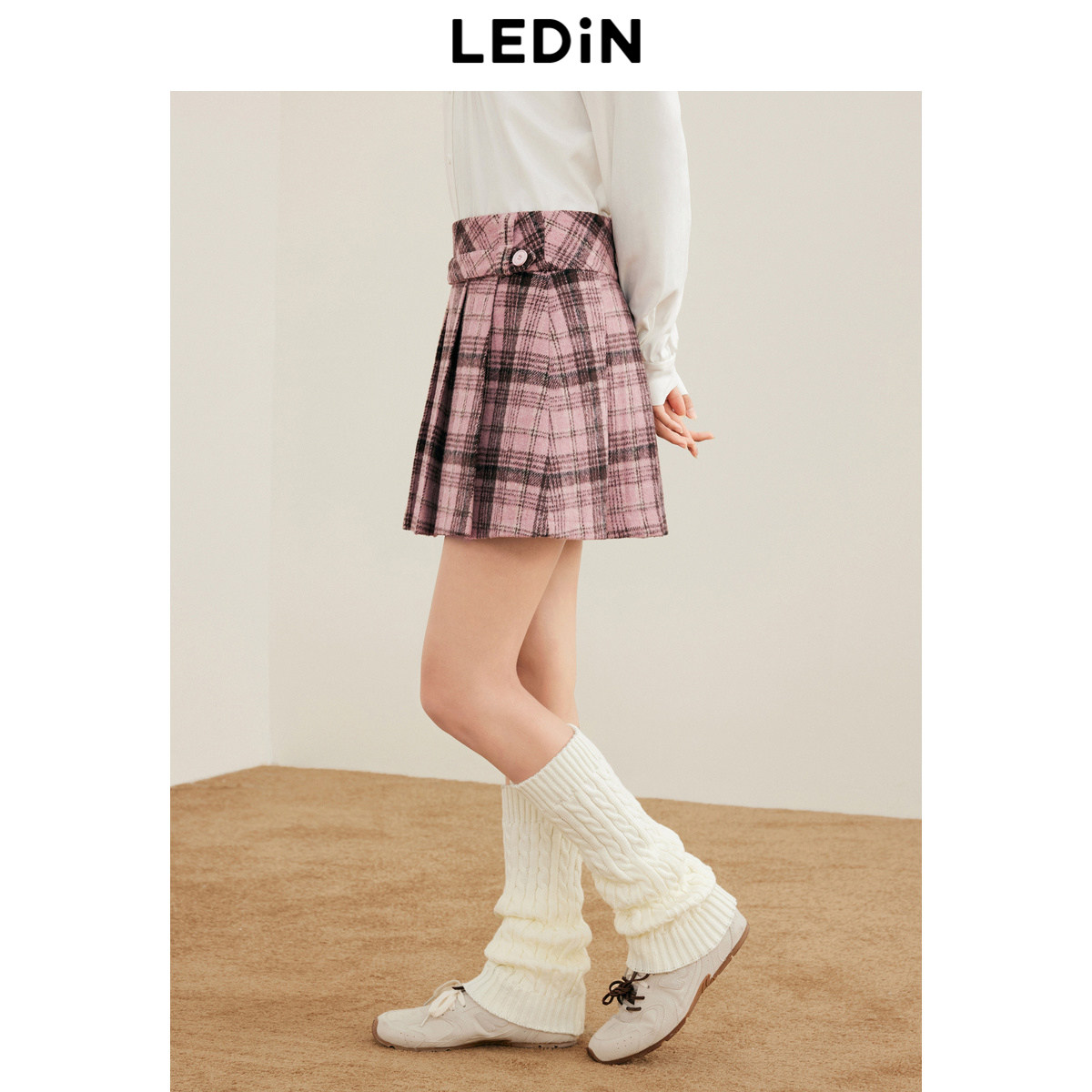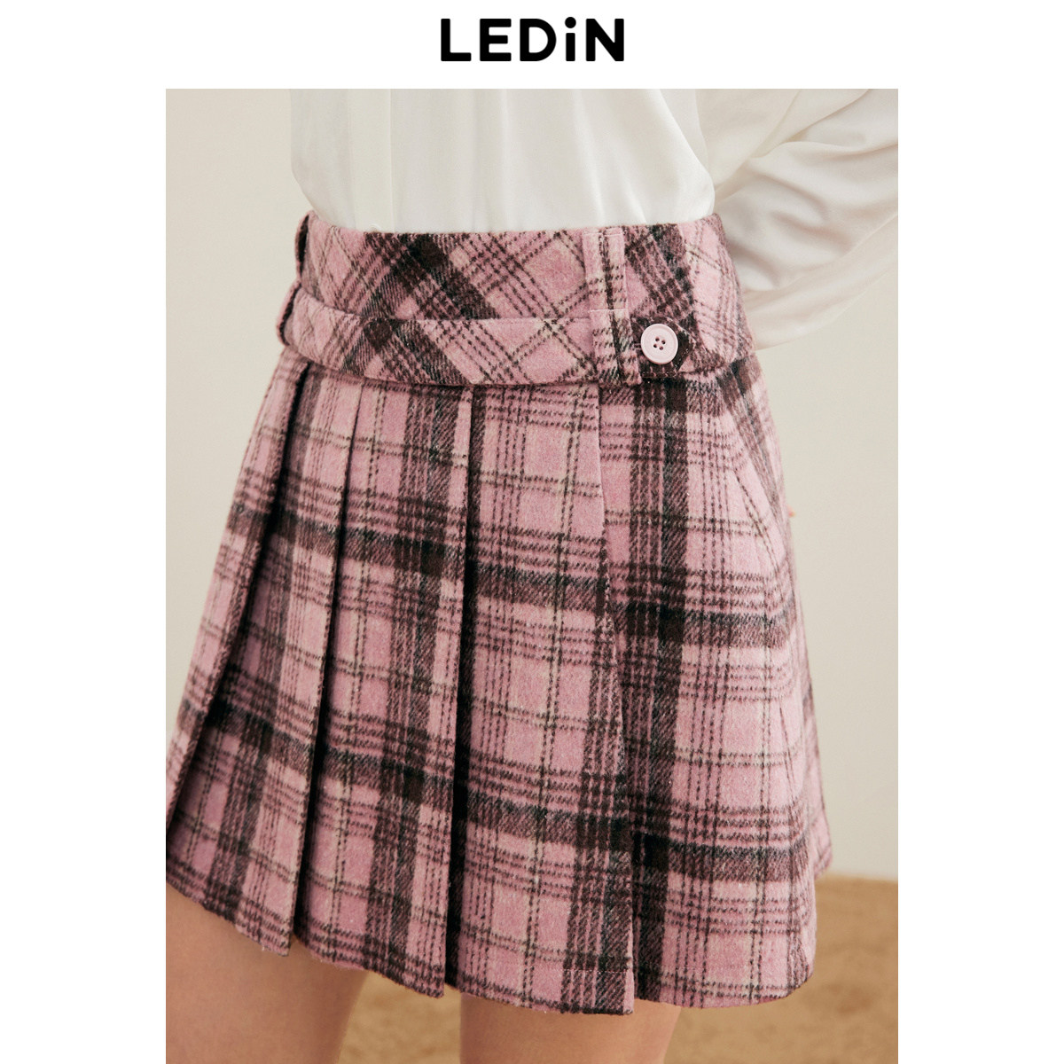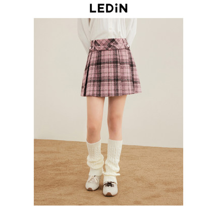 乐町学院风格纹百褶半身裙冬季新款粉色毛呢短裙装饰腰A字裙