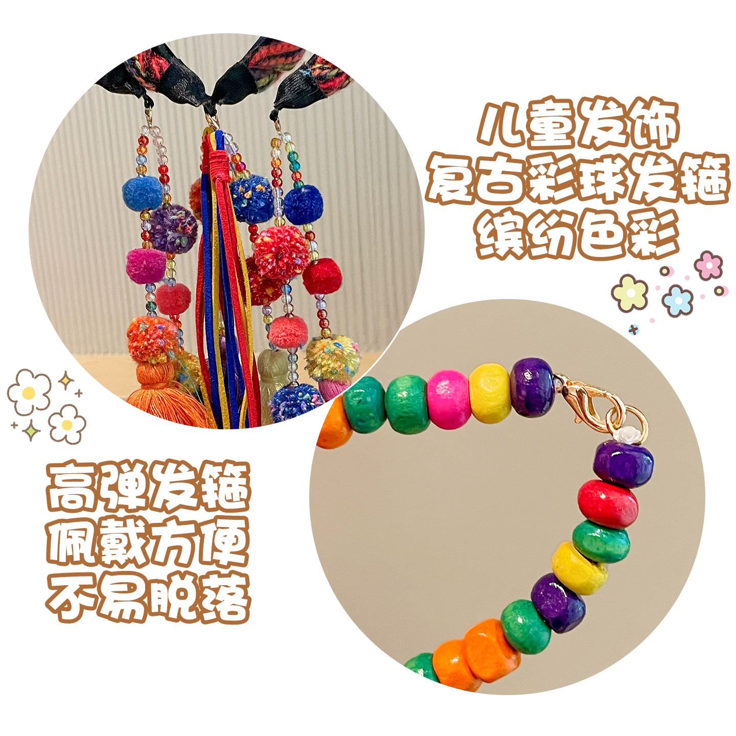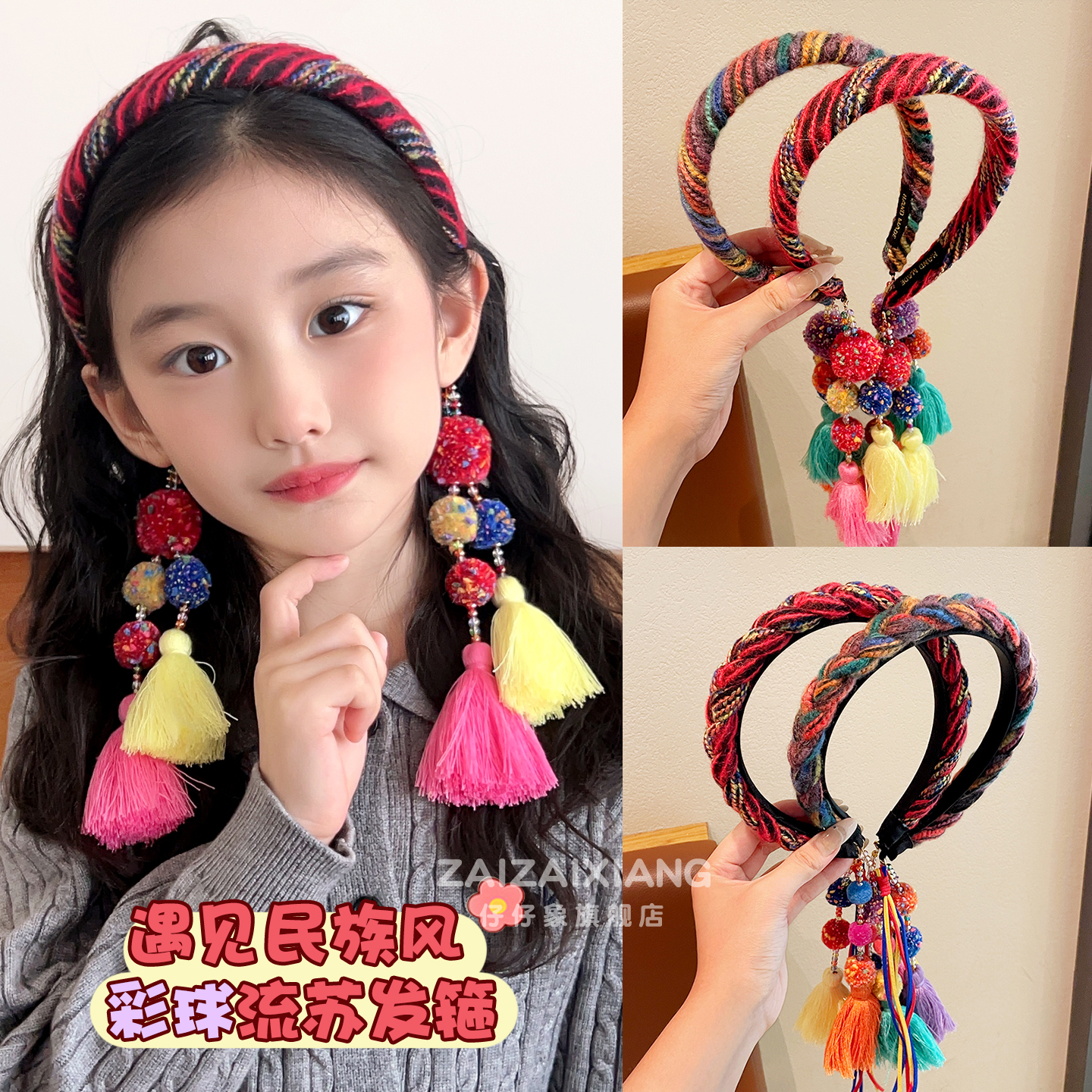 2025民族风新款儿童发箍女童压发防滑头箍不伤发女孩毛球流苏发饰