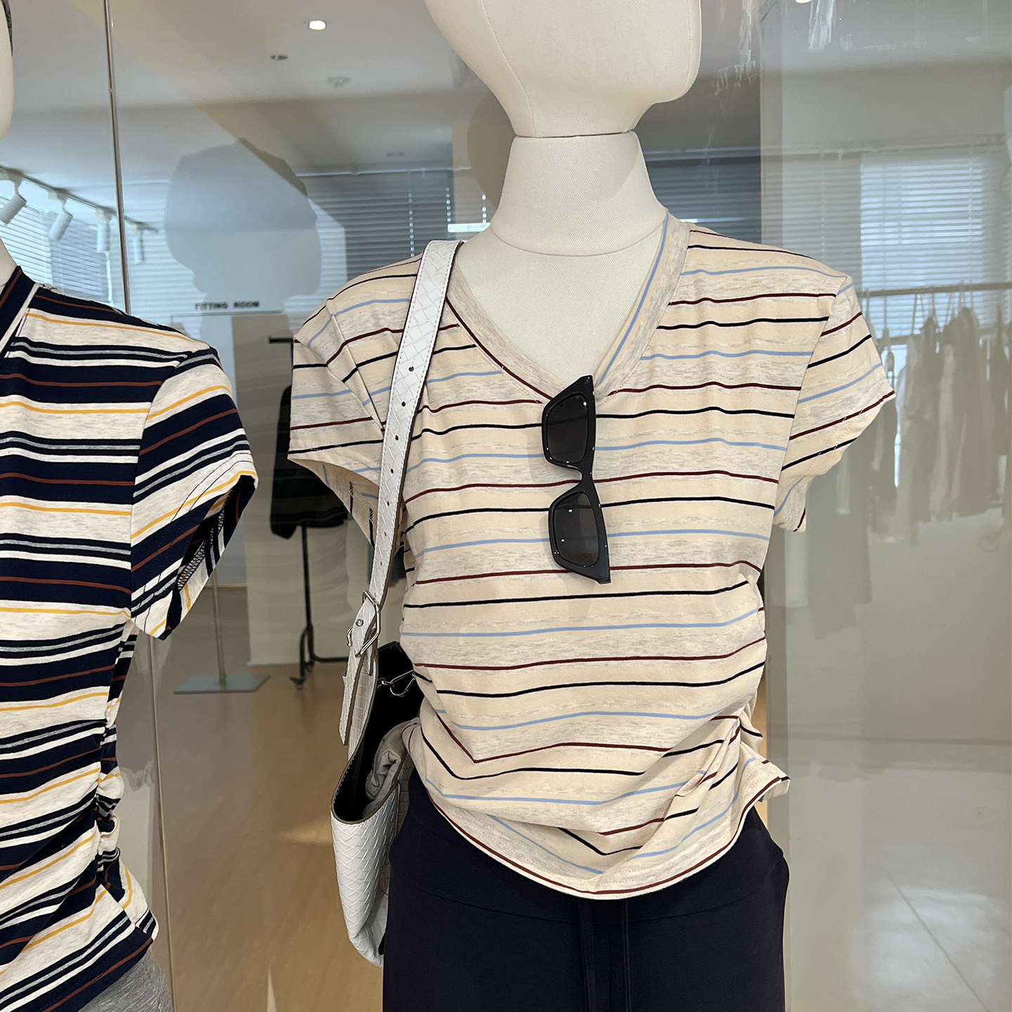 撞色条纹t恤女短袖夏正肩修身v领褶皱收腰短款体恤衫日常休闲上衣