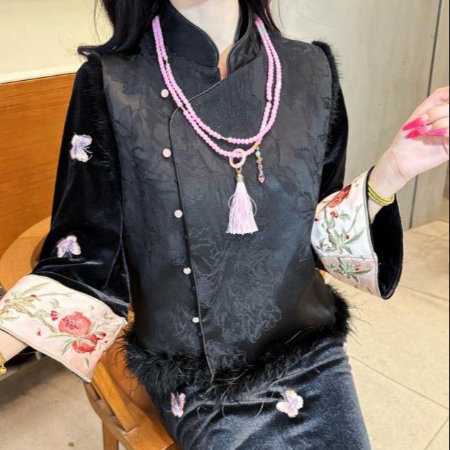 300斤大码连衣裙秋冬新款温柔丝绒新中式珠炼瑶池粉蝶印花旗袍裙