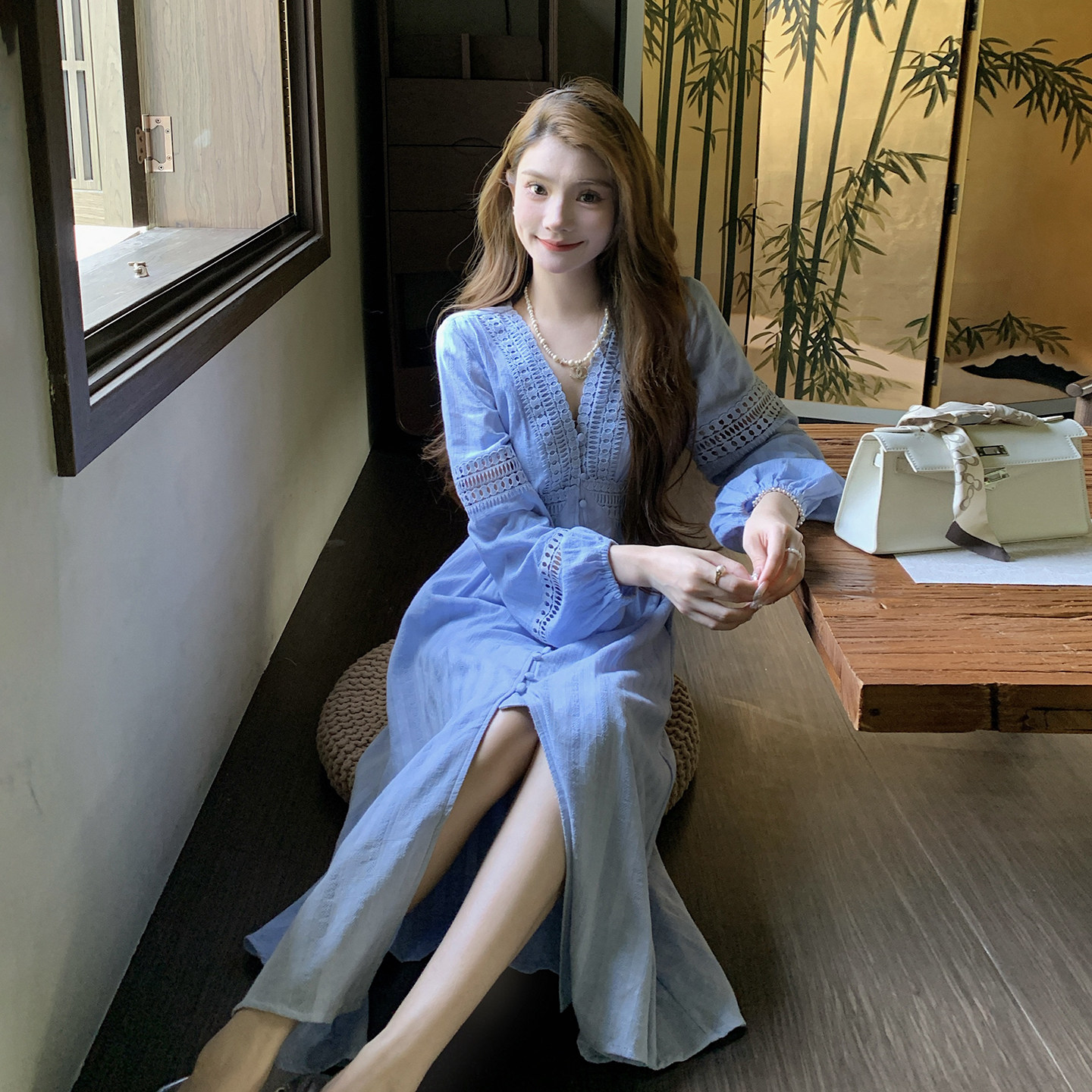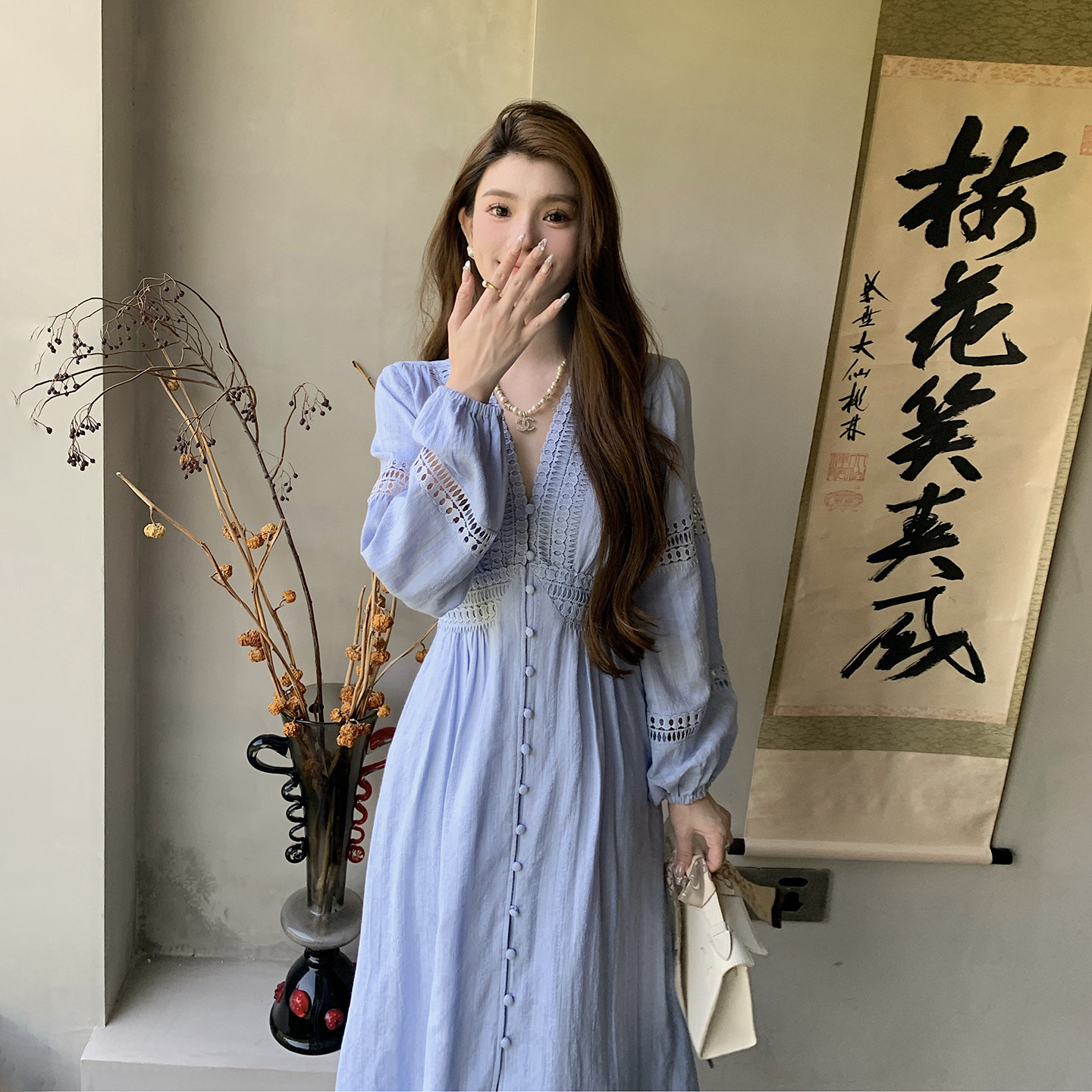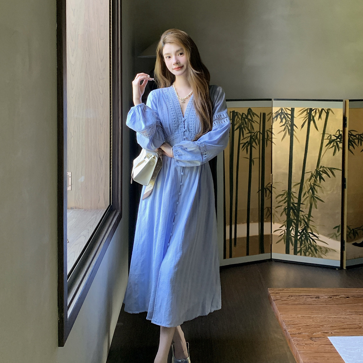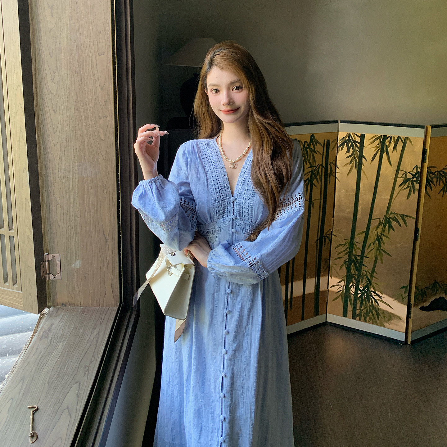 AM NANA法式气质V领长袖连衣裙女设计感蕾丝拼接小个子打底长裙子