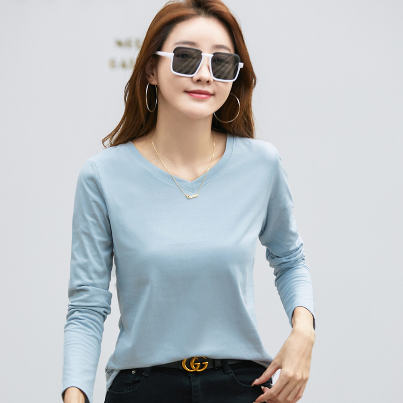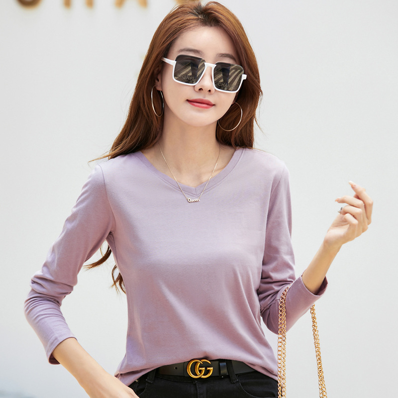秋冬长袖纯色V领百搭打底衫女t恤纯棉内搭洋气时尚上衣体恤衫百搭