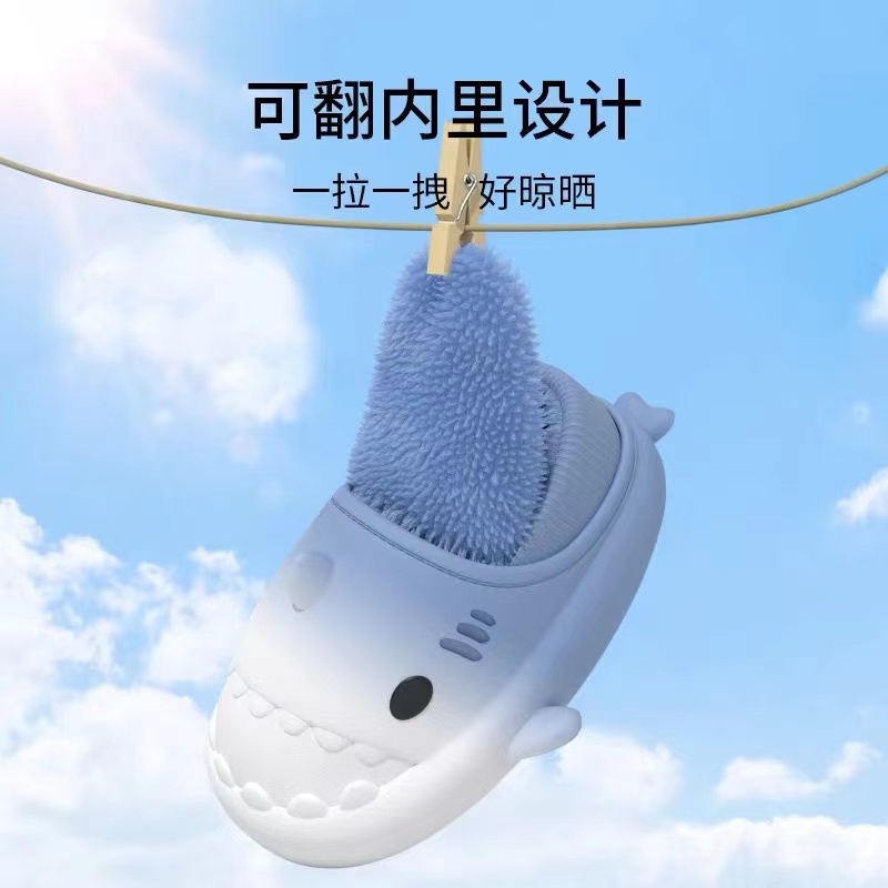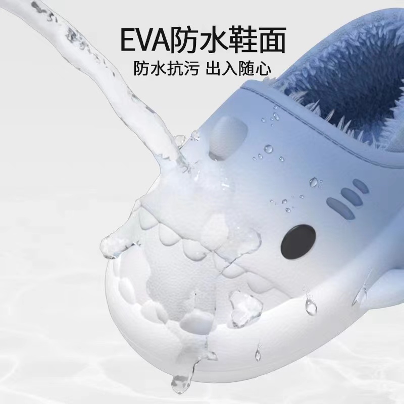 渐变鲨鱼棉拖鞋冬季居家儿童厚底防水家居可爱女毛绒男士外穿包跟