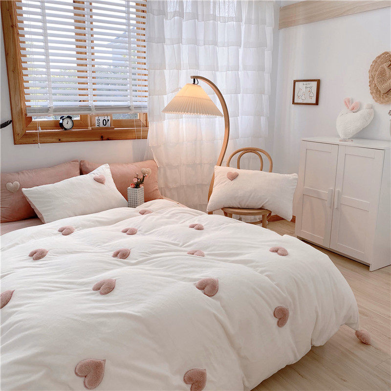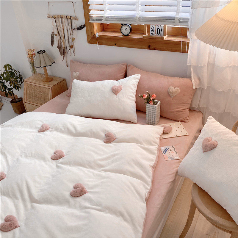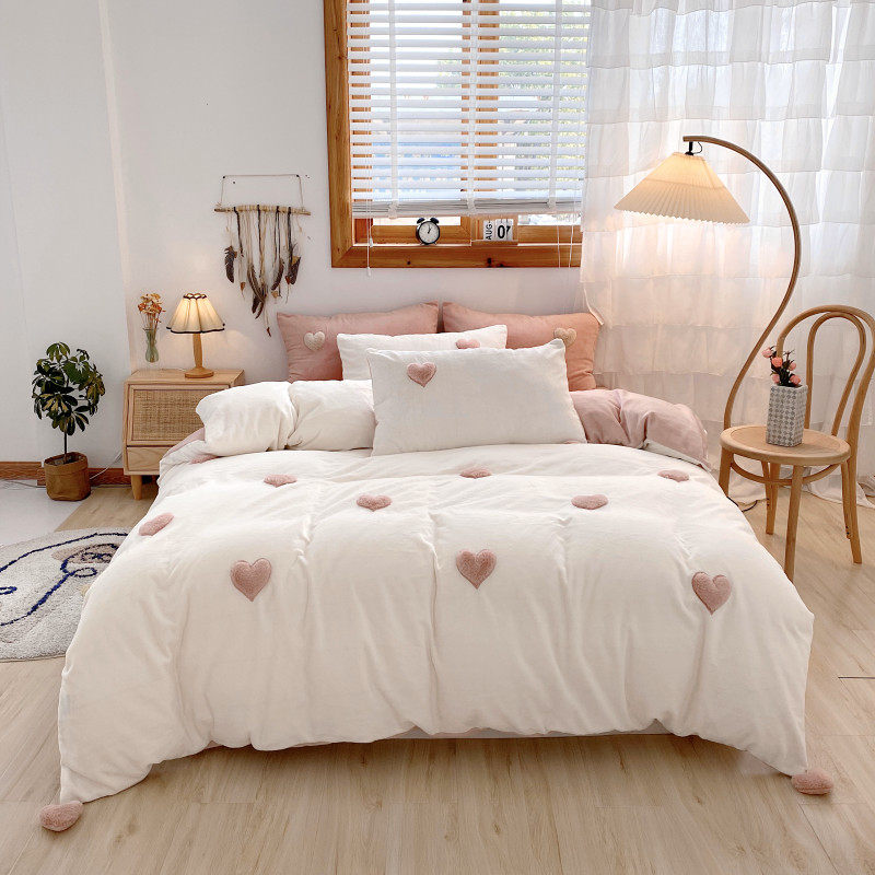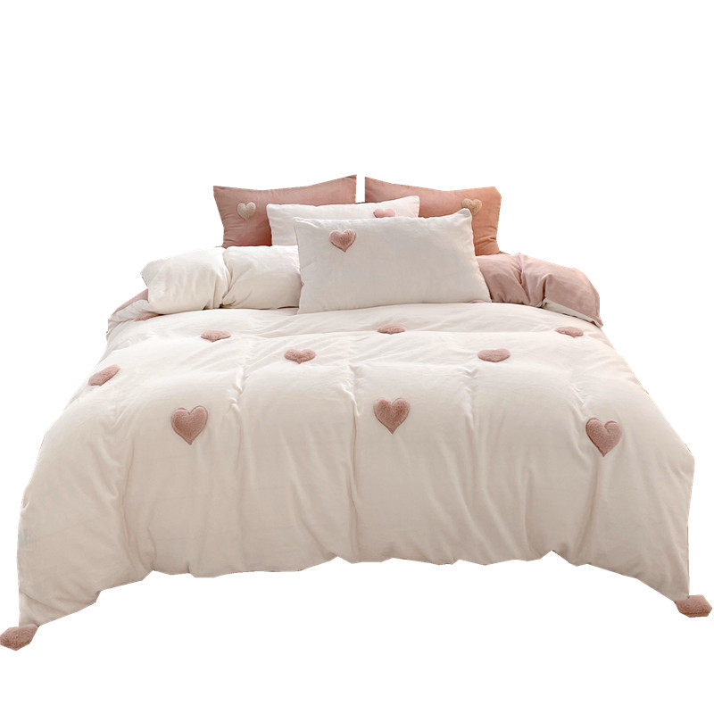 biu biu~立体爱心保暖牛奶绒四件套冬季珊瑚绒双面法兰绒被套韩式