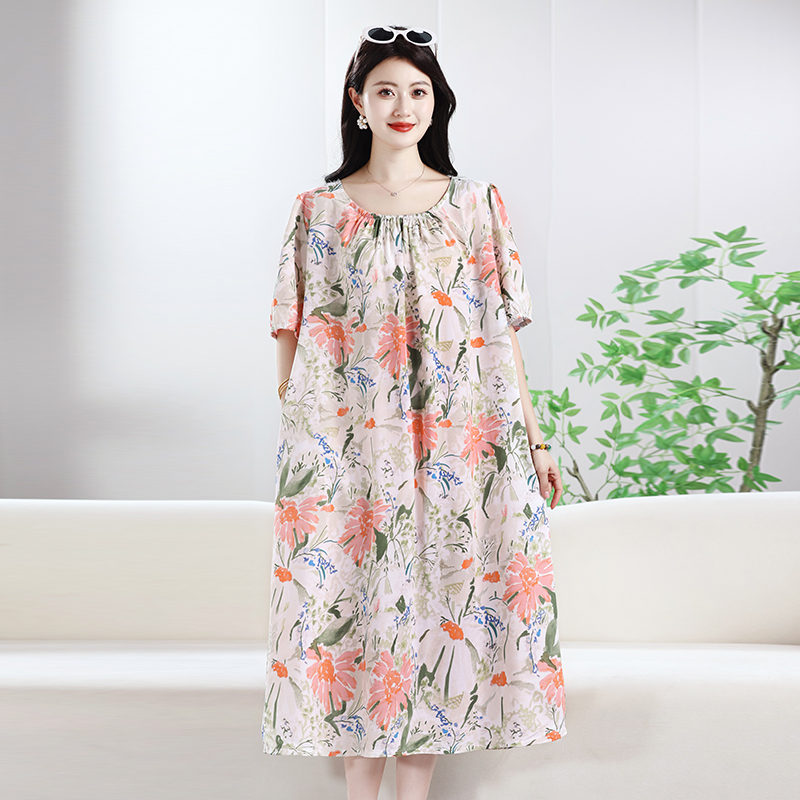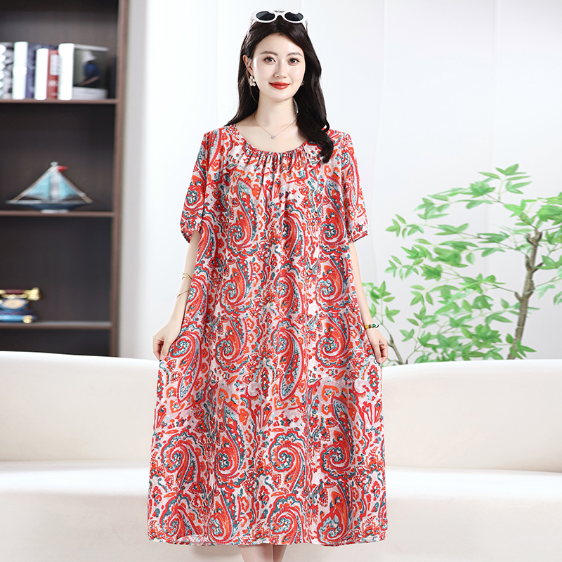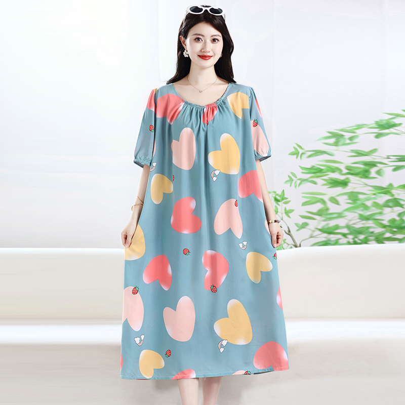 夏季薄款短袖棉绸睡裙女宽松薄款人造棉家居服睡衣加宽加长连衣裙