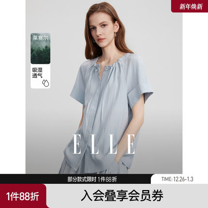 ELLE法式抽褶短袖衬衫女2025夏季新款莱赛尔天丝优雅设计感衬衣