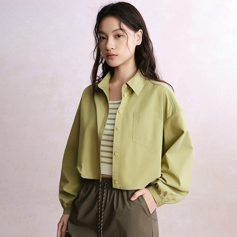 PIT复古绿色翻领长袖短款衬衫外套女2025夏薄款透气上衣