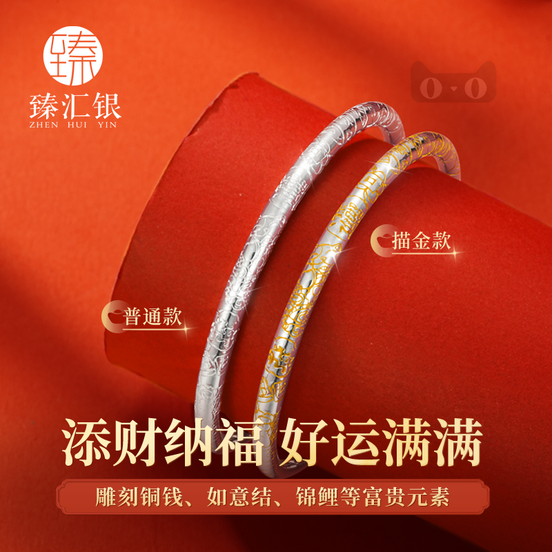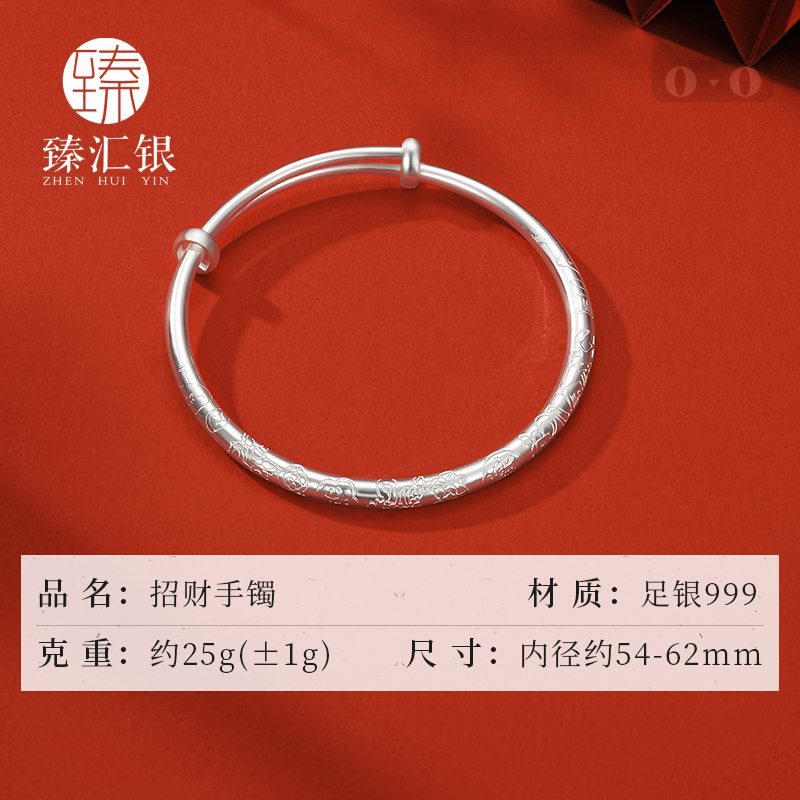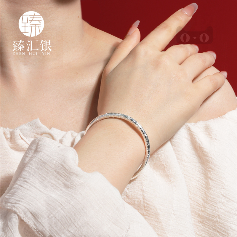 臻汇银纯银手镯女中国白银足银999招财小众素圈推拉手镯生日礼物