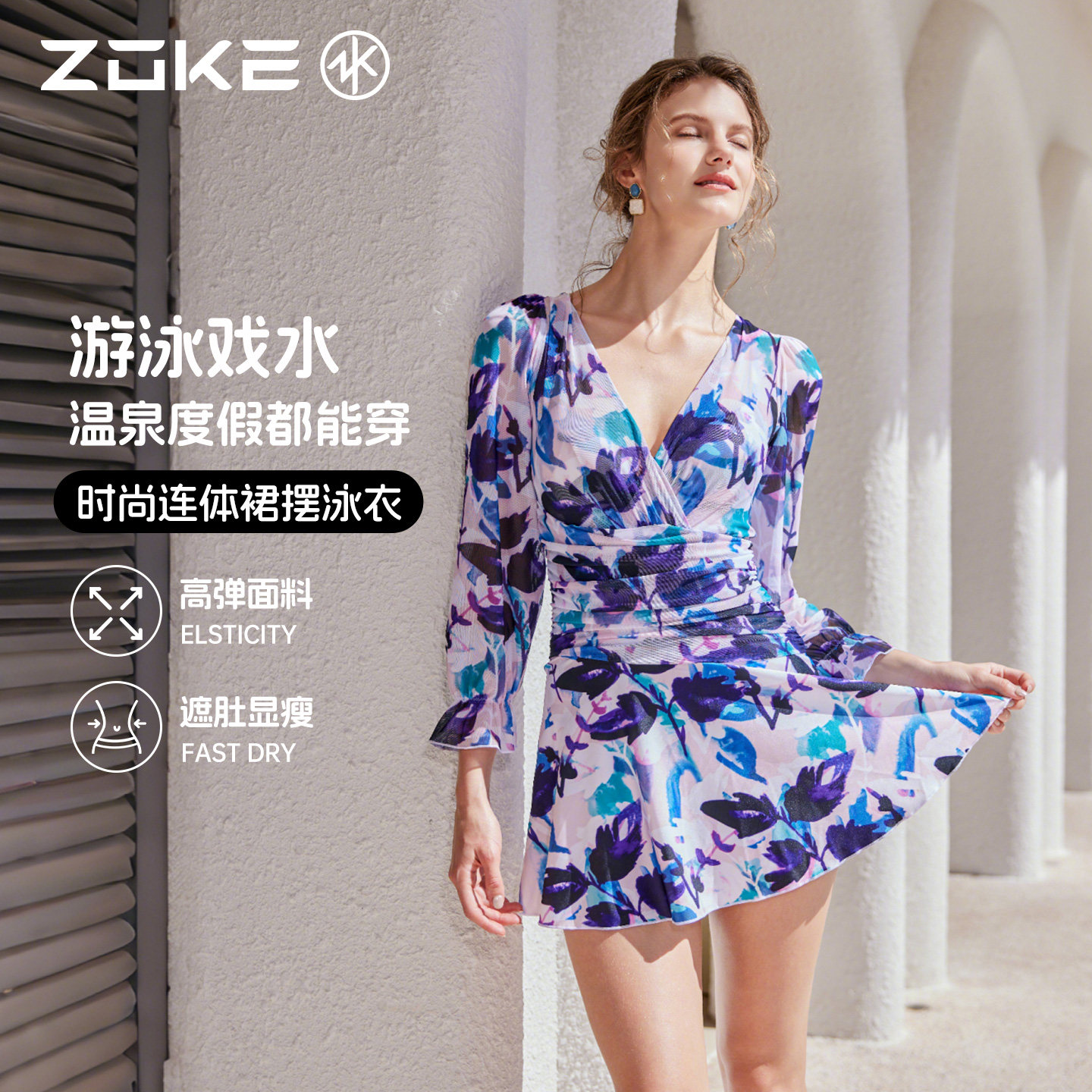 洲克泳衣防晒长袖泡温泉连体裙摆平角女大码游泳zoke显瘦保守泳装
