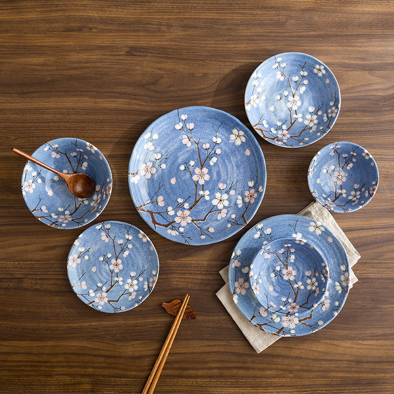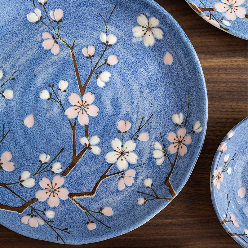 日本进口樱花釉下盘子餐盘平盘蓝色陶瓷家用日式餐具汤碗组合套装