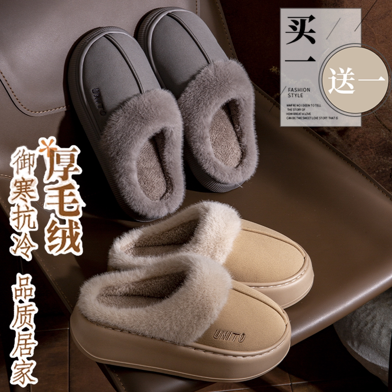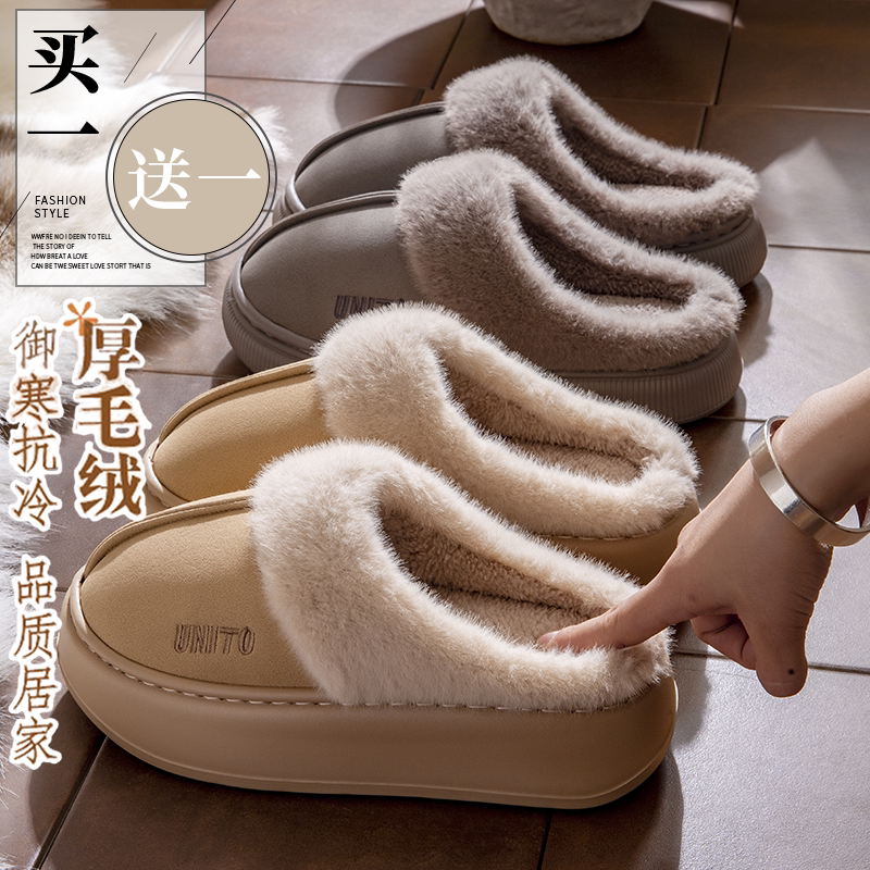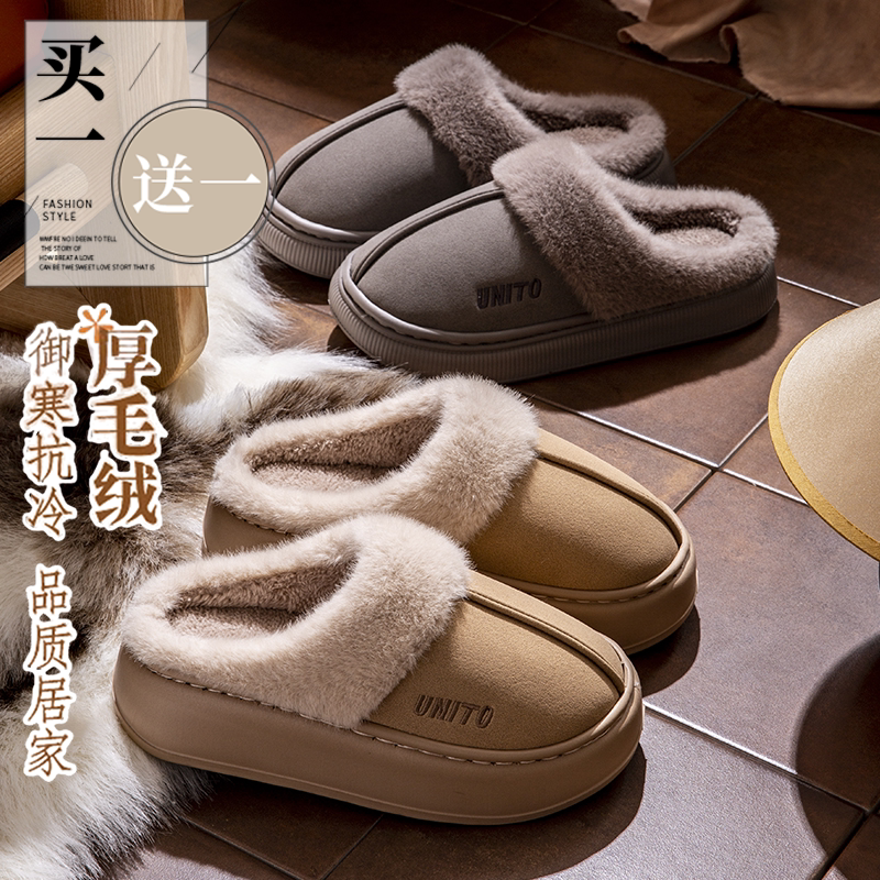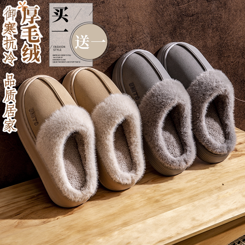 买一送一厚底棉拖鞋女款冬季2024新款室内家居加绒保暖情侣棉拖男