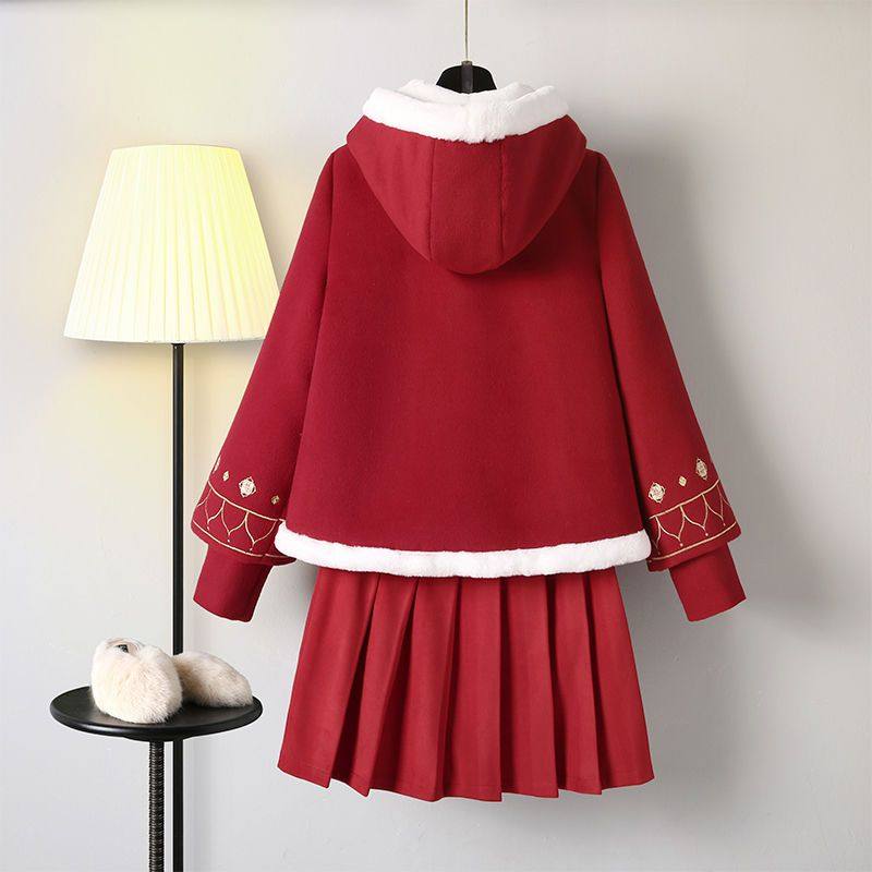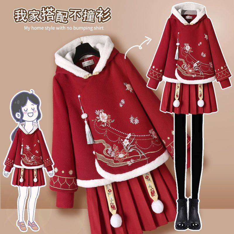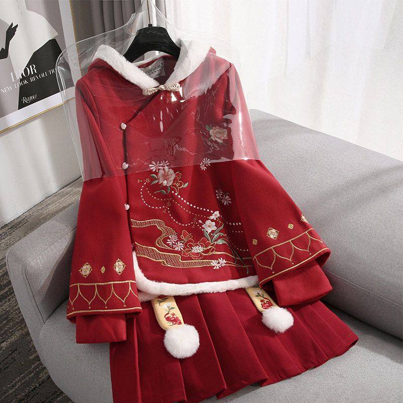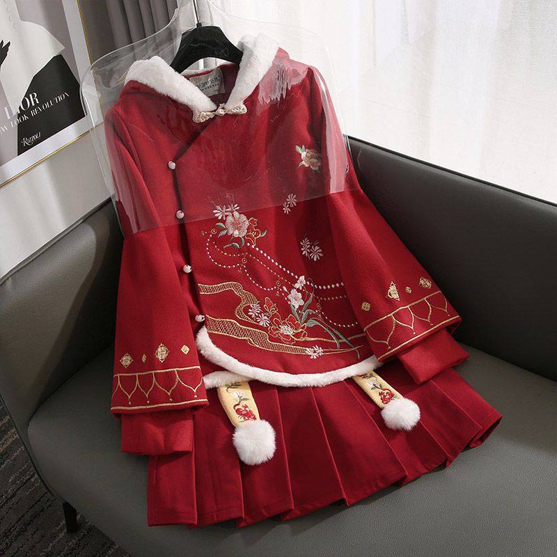 汉服女中国风连衣裙秋冬套装古装改良旗袍中式上衣汉元素日常红色