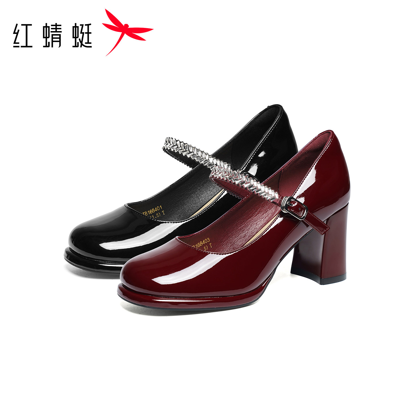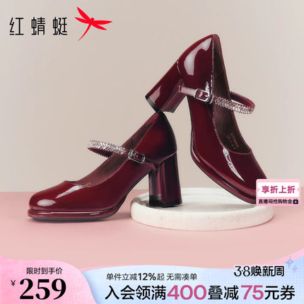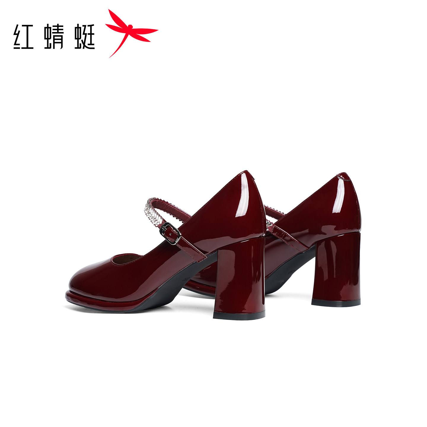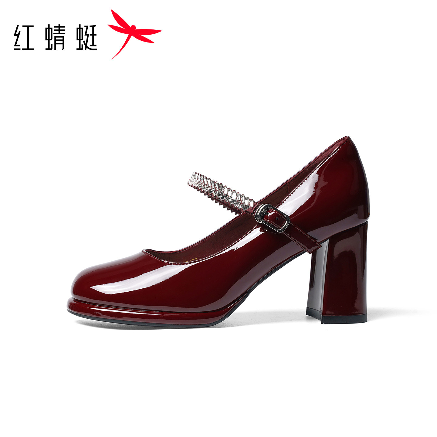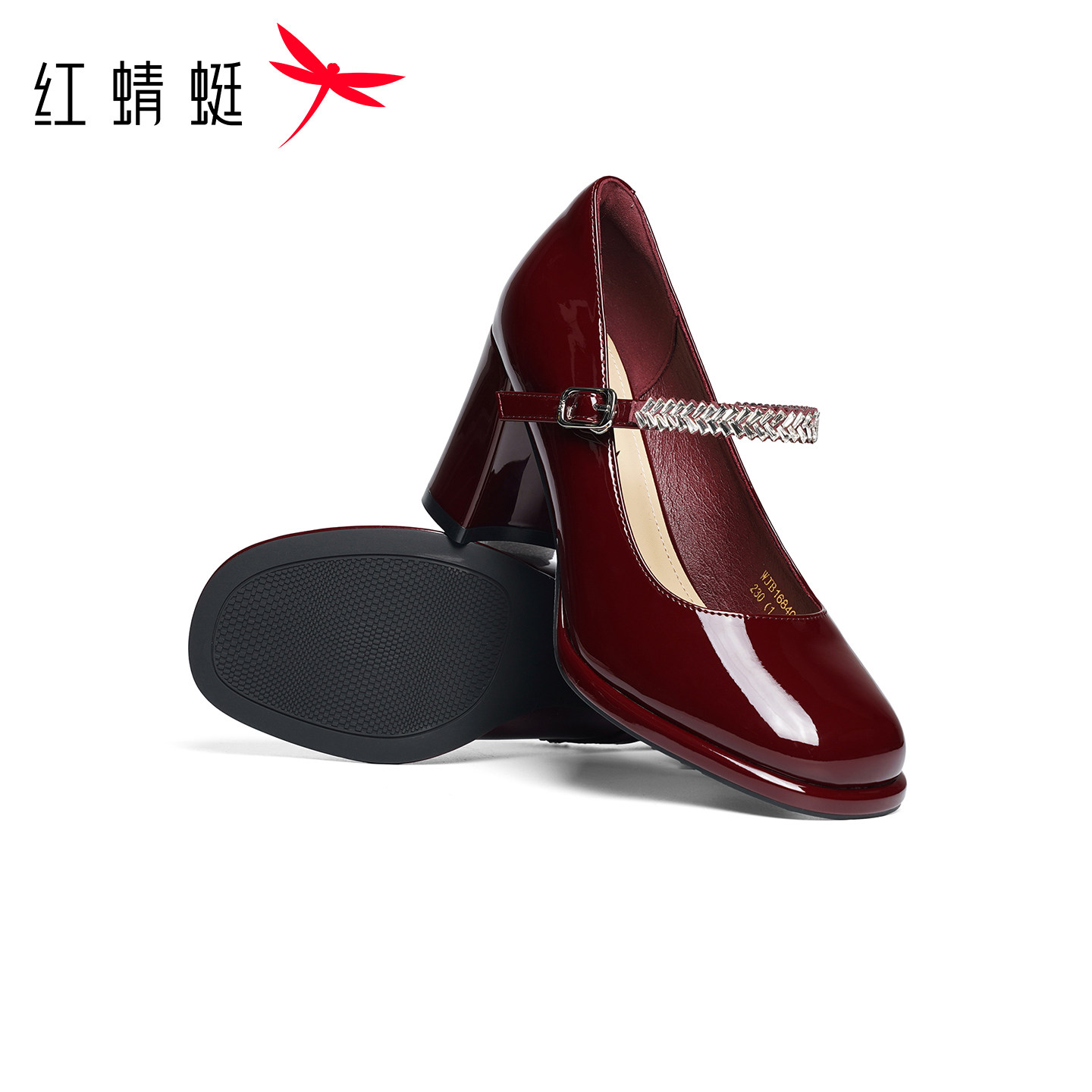 红蜻蜓红色高跟婚鞋女玛丽珍鞋2026春季新款女鞋粗跟皮鞋法式单鞋
