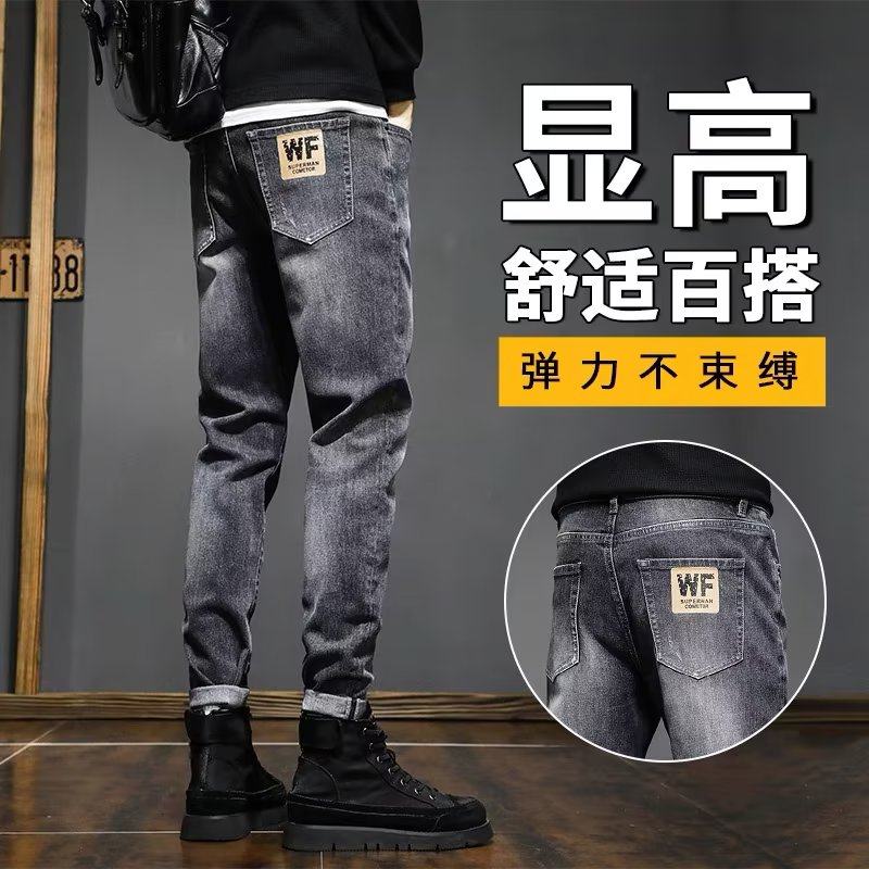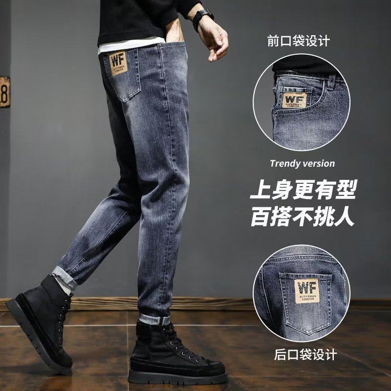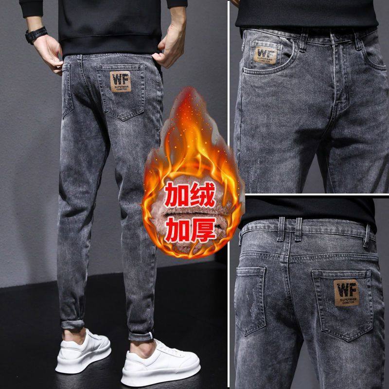 秋冬季加绒加厚牛仔裤男士弹力修身小脚休闲裤子男耐磨工作九分裤