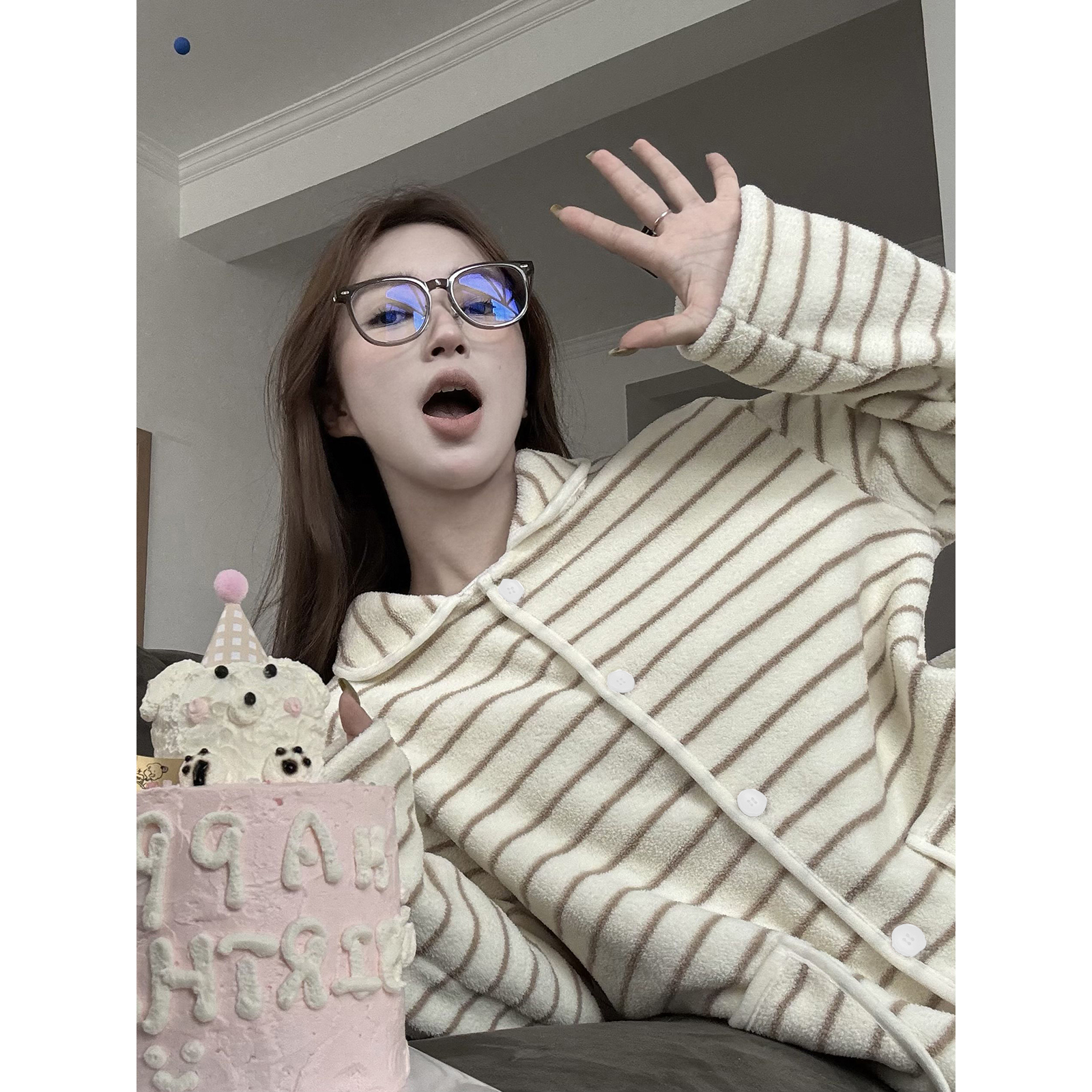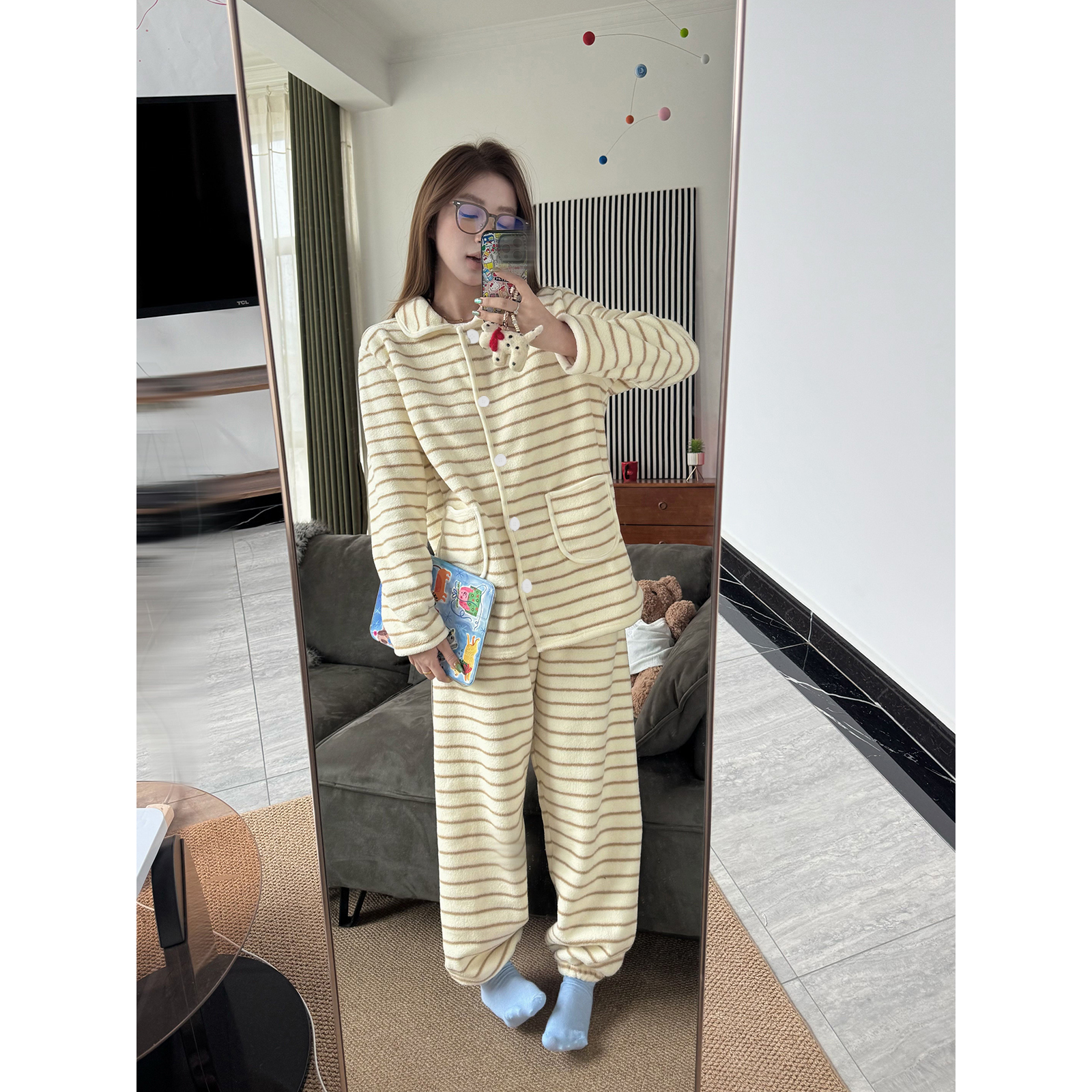 JoyceBra 秋冬新款条纹珊瑚绒睡衣女加厚保暖软糯亲肤家居服套装