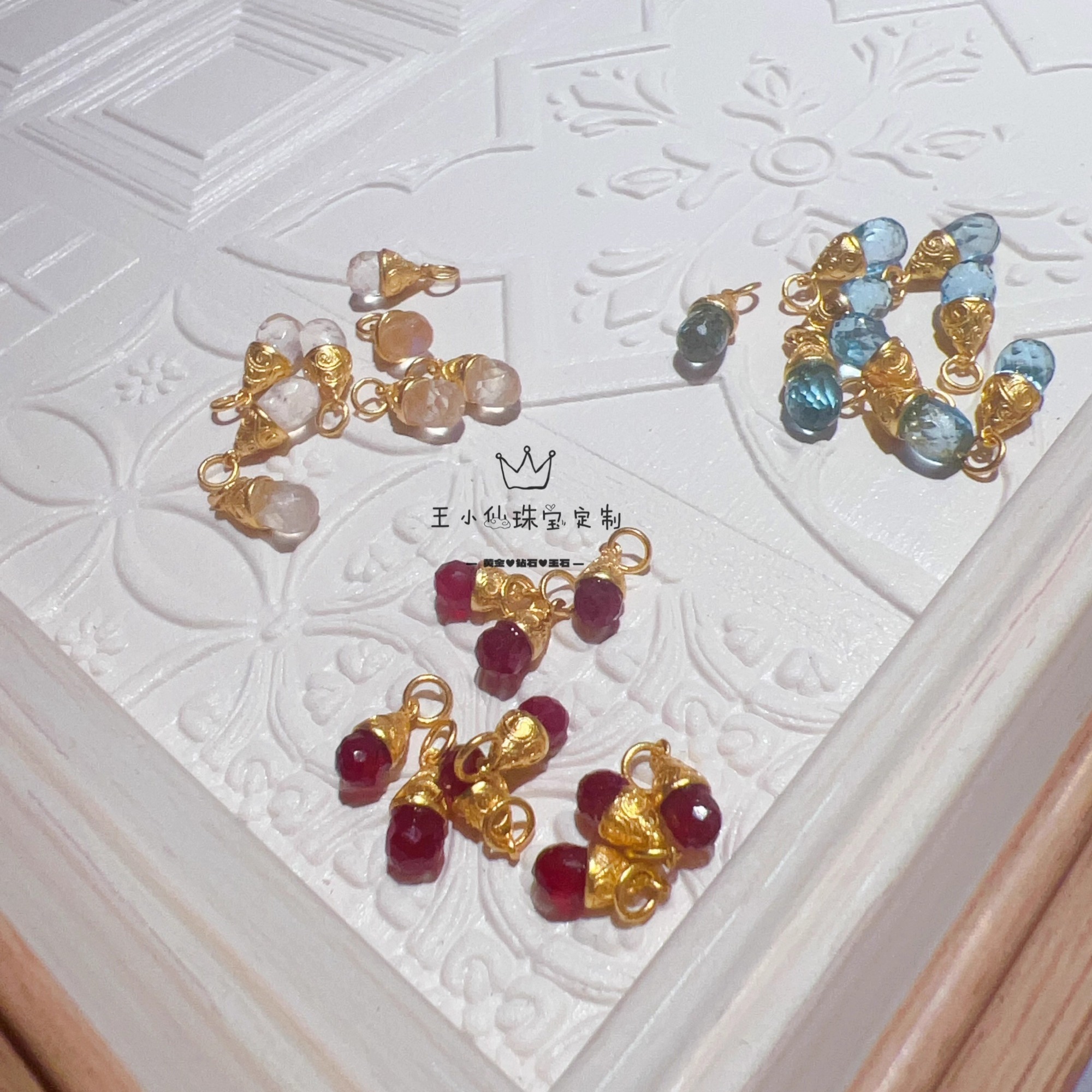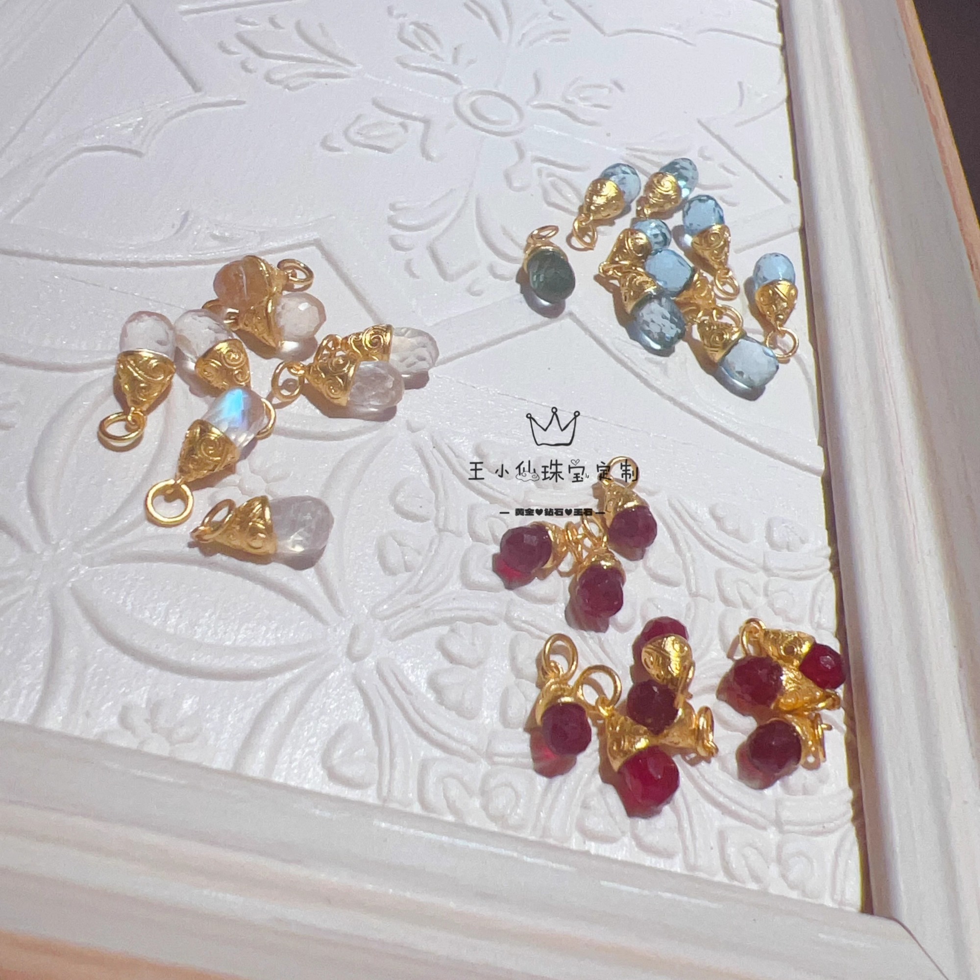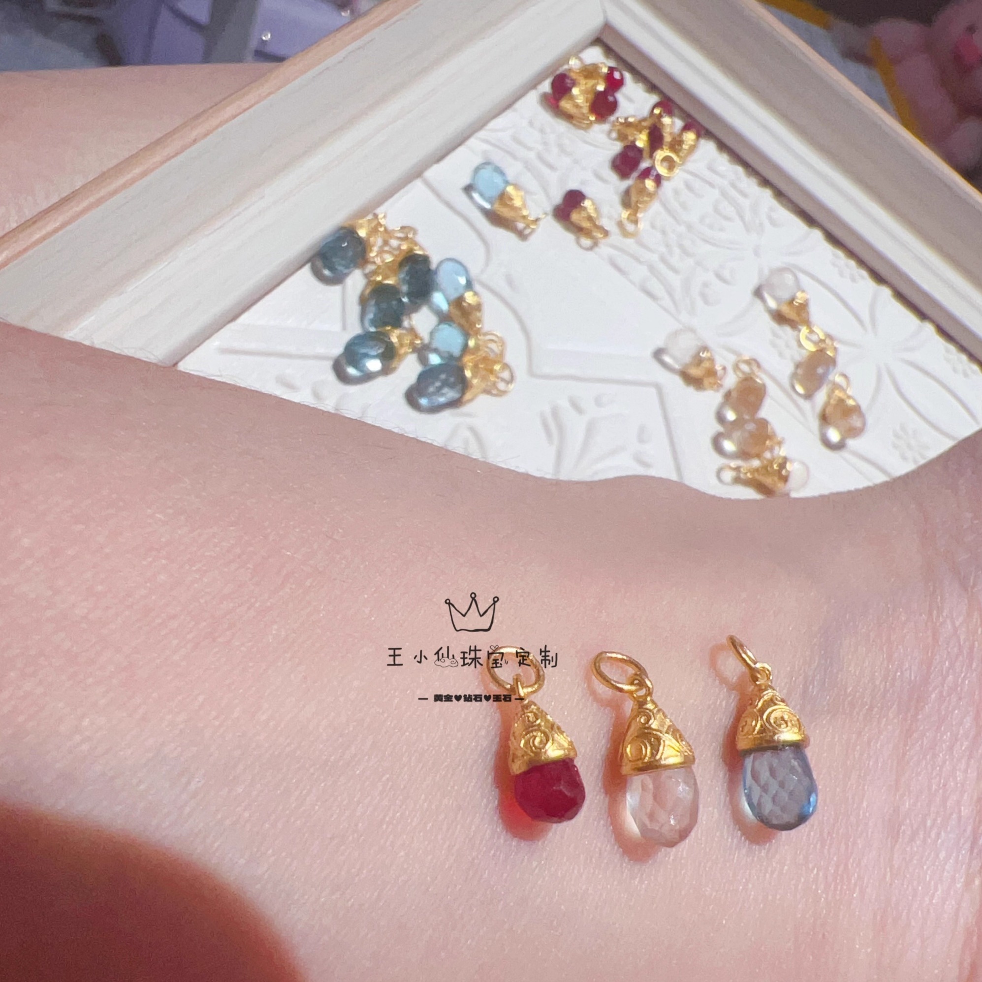 足金999手工古法金宝石镶嵌小提溜切割面红宝石月光石托帕石吊坠