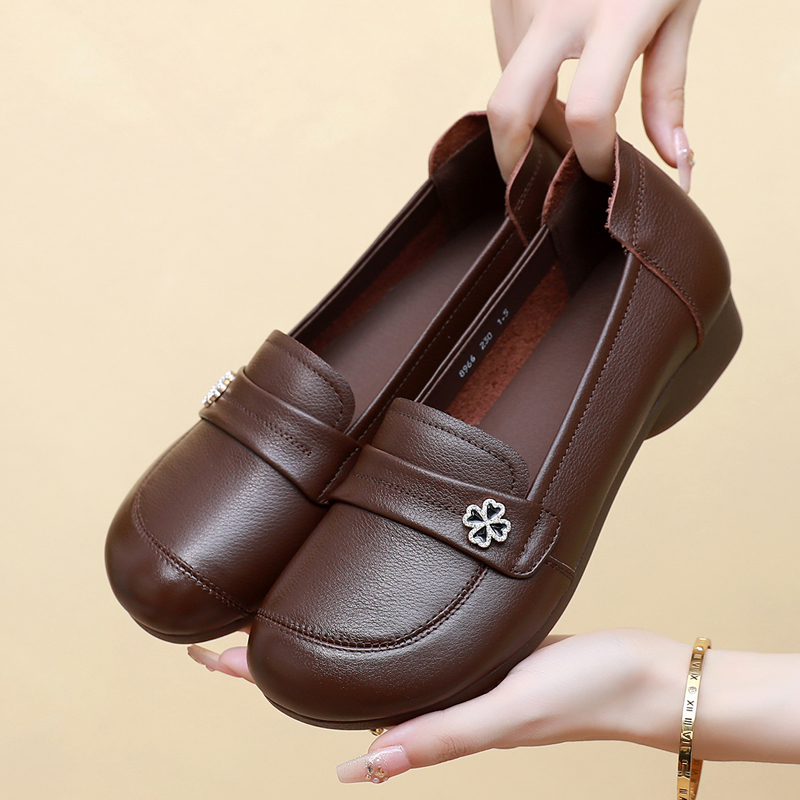 全牛皮妈妈鞋春秋新款女鞋复古舒适乐福鞋百搭平底单鞋中老年皮鞋