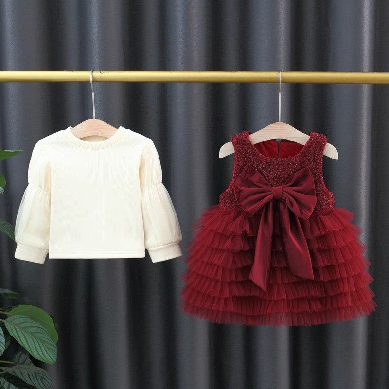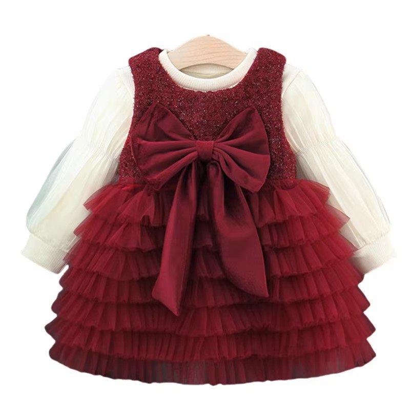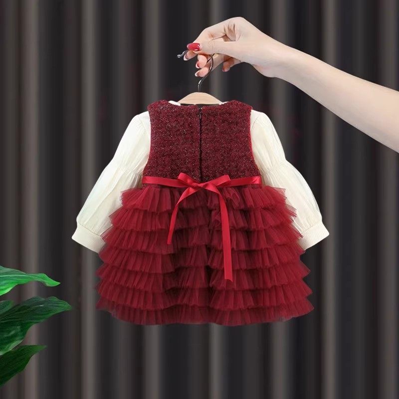 女童冬装2025新款长袖连衣裙女宝宝秋冬灯笼袖红色加绒公主纱纱裙