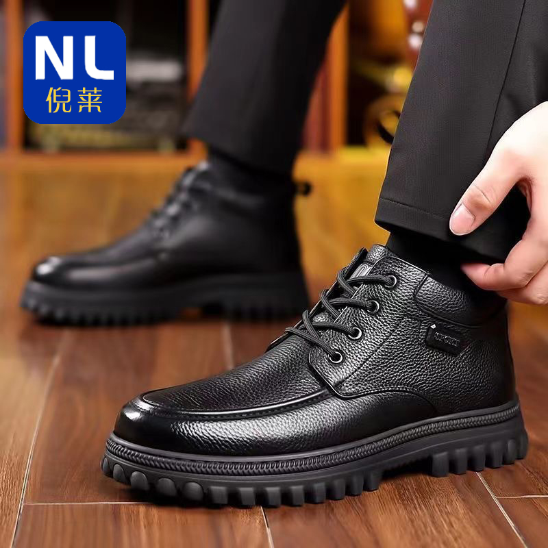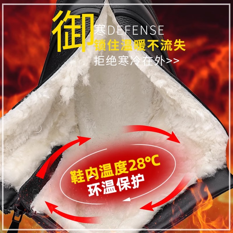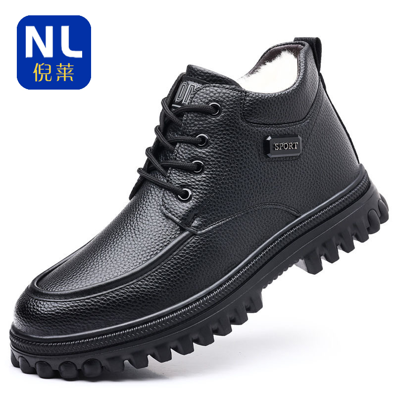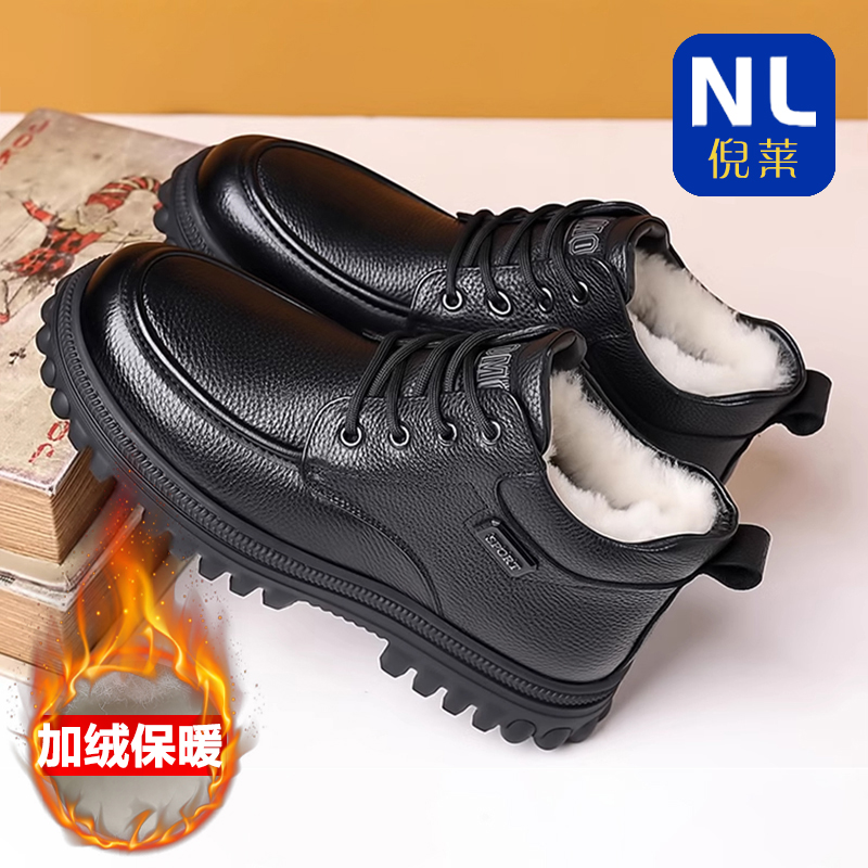 冬季加绒保暖棉皮鞋男士真皮中老年软底爸爸鞋纯羊毛加厚棉鞋高帮