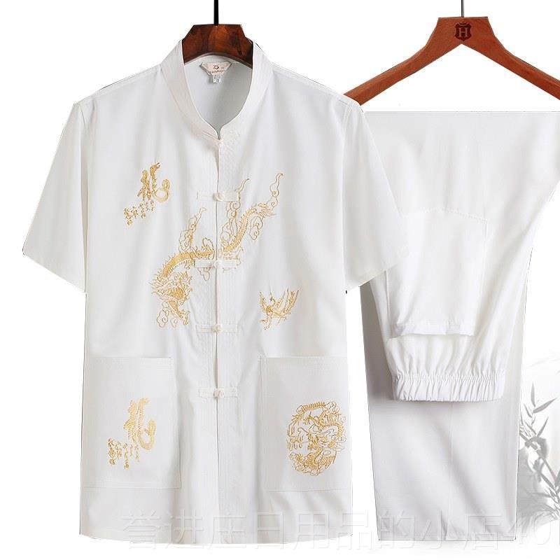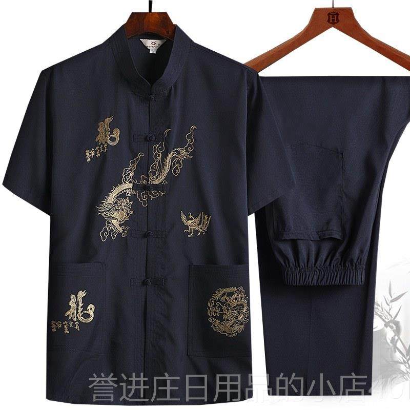 正品中老年人夏套装唐男短袖衬衫刺绣爸季爸大尺爷码晨练服爷汉服