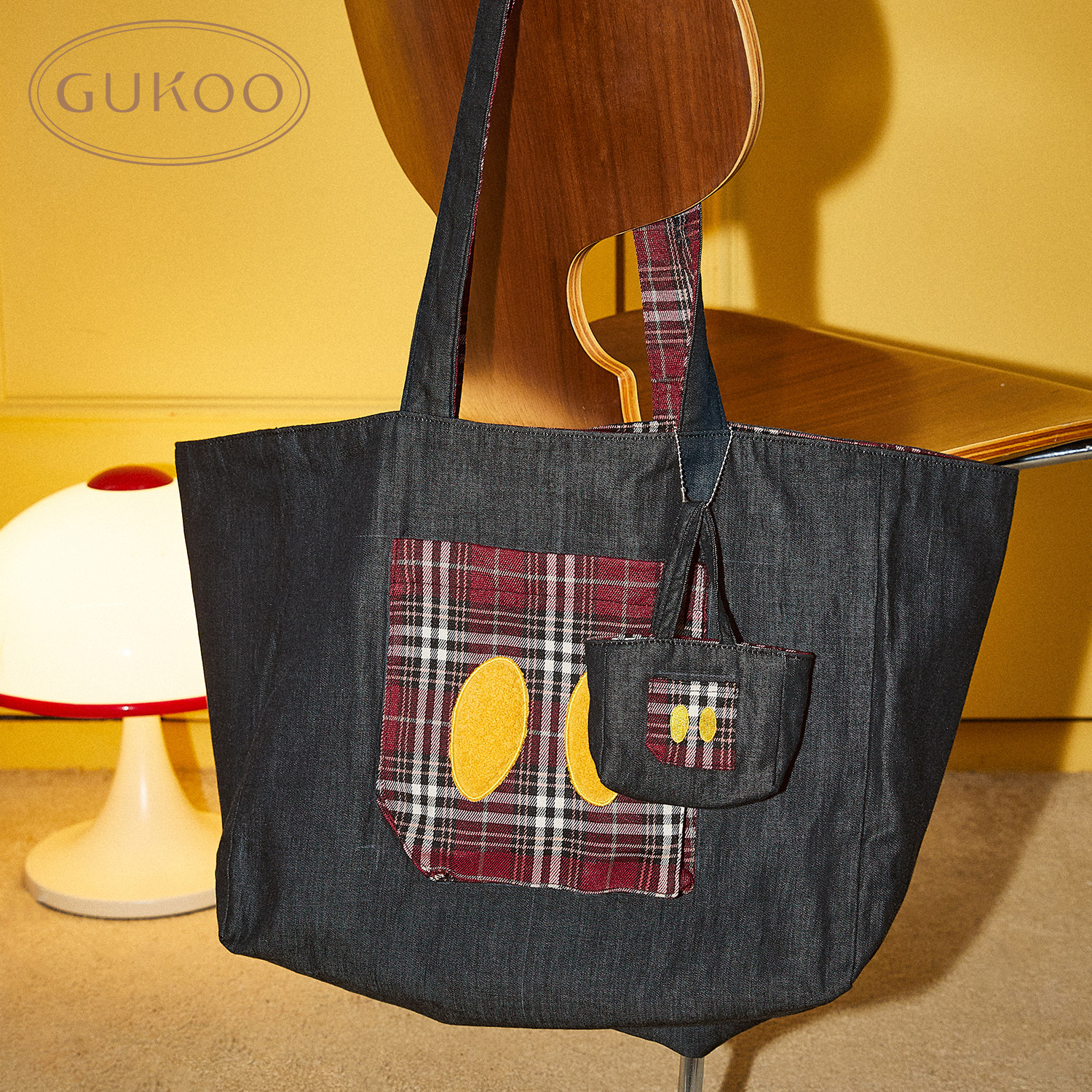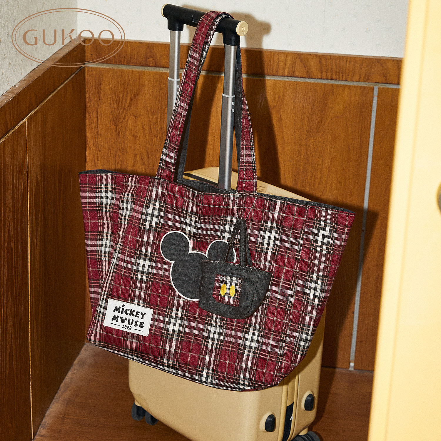 Gukoo/果壳双面手提包迪士尼联名格纹米奇帆布包女士托特包单肩包