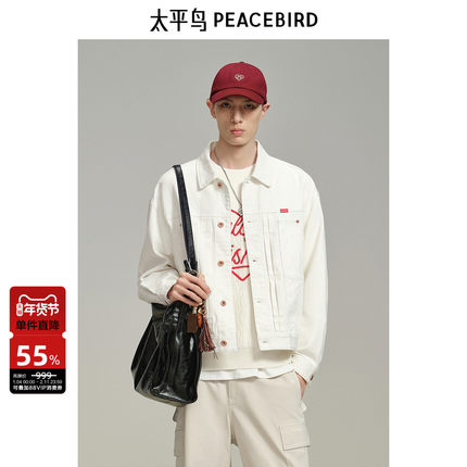 太平鸟男装白色牛仔夹克秋季工装翻领外套宽松时尚刺绣茄克
