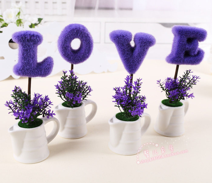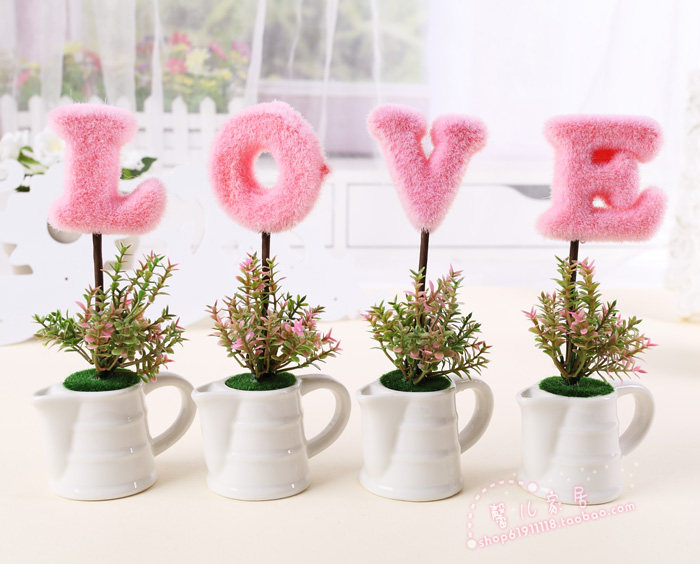 LOVE植绒仿真花套装 假花小盆景 桌面绿色仿真植物盆栽摆件