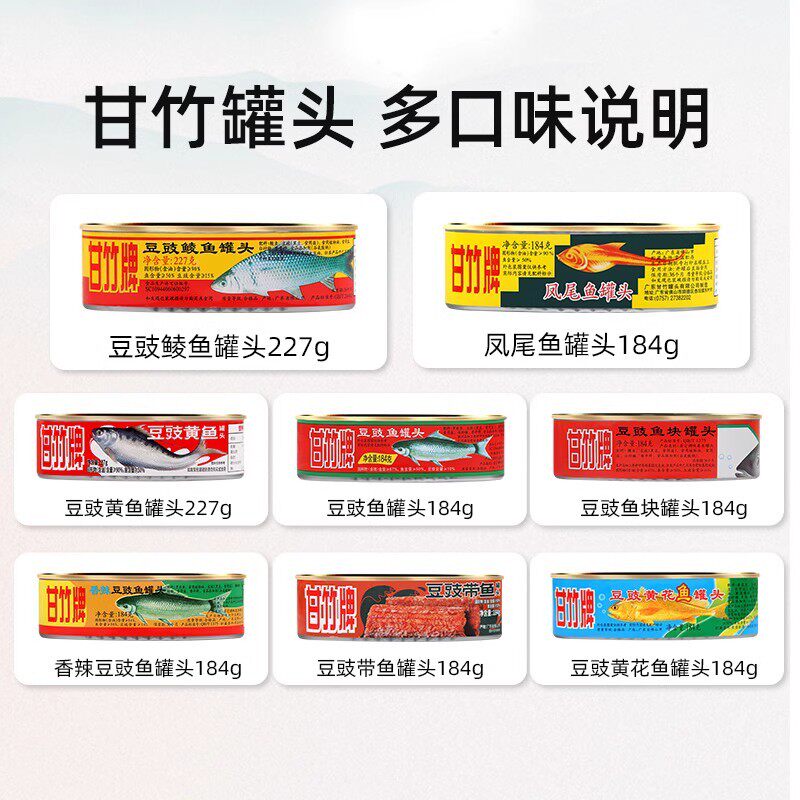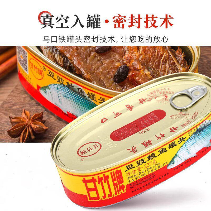 甘竹牌豆豉鲮鱼肉罐头即食下饭菜广东老式食品带鱼黄花鱼整箱批发