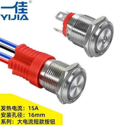 一佳YJ-GQ16AS带灯短款15A防水不锈钢金属按键大电流按钮开关16mm