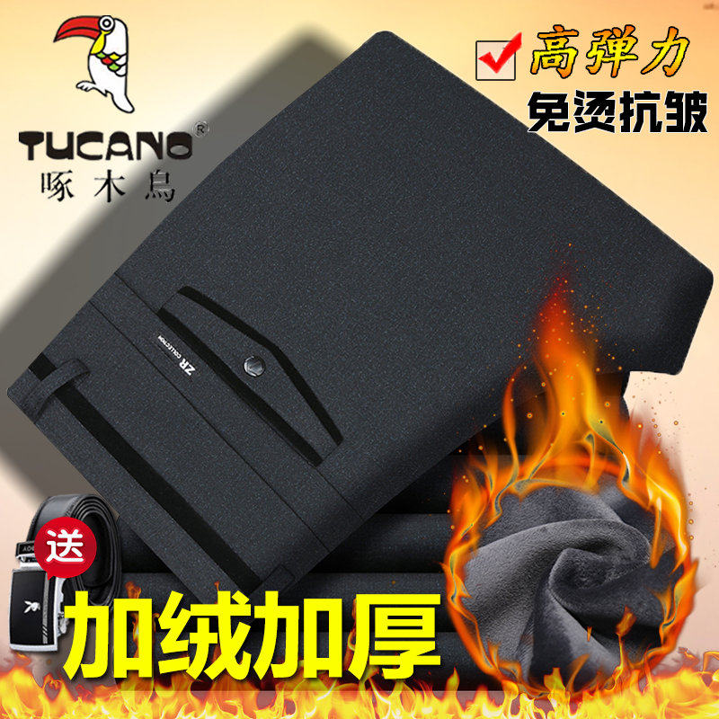 啄木鸟男士加绒加厚休闲裤男冬季中年商务直筒宽松男裤子免烫长裤