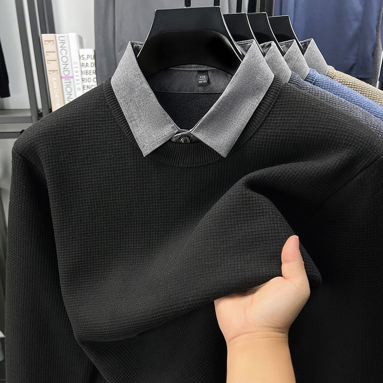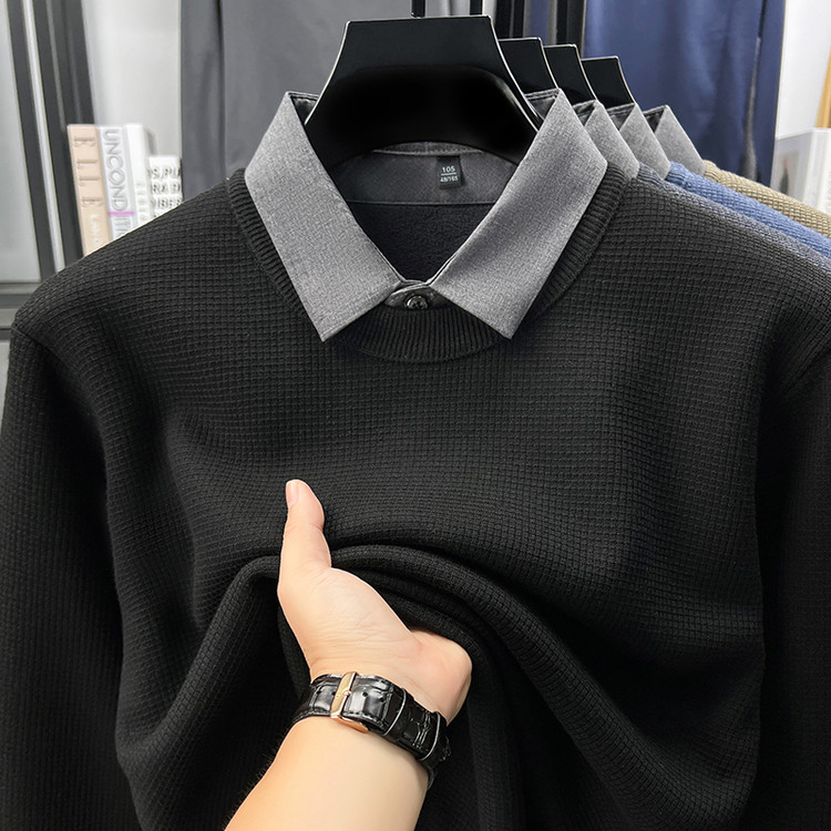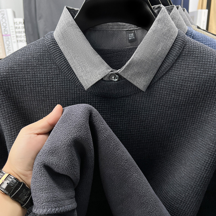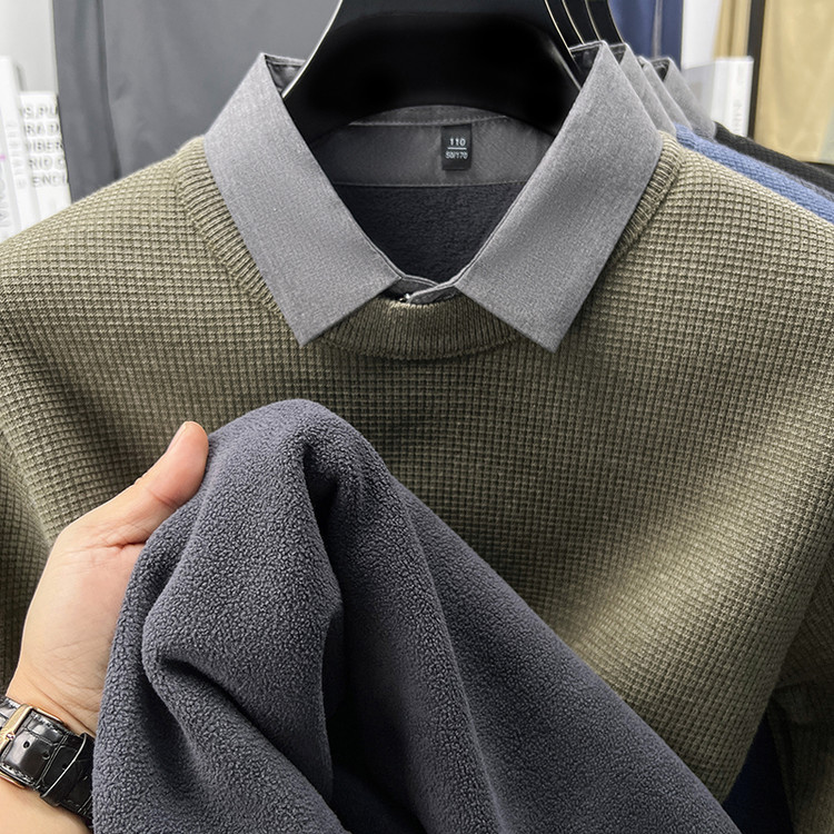 2025秋冬新款假两件绵羊毛毛衣男士商务休闲加绒加厚衬衫领针织衫